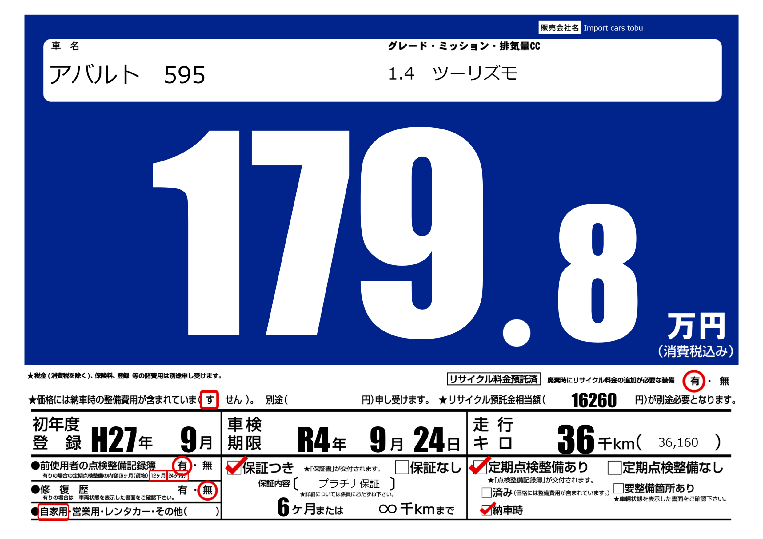 | 車名 | アバルト 595 | グレード ミッション 排気量 |