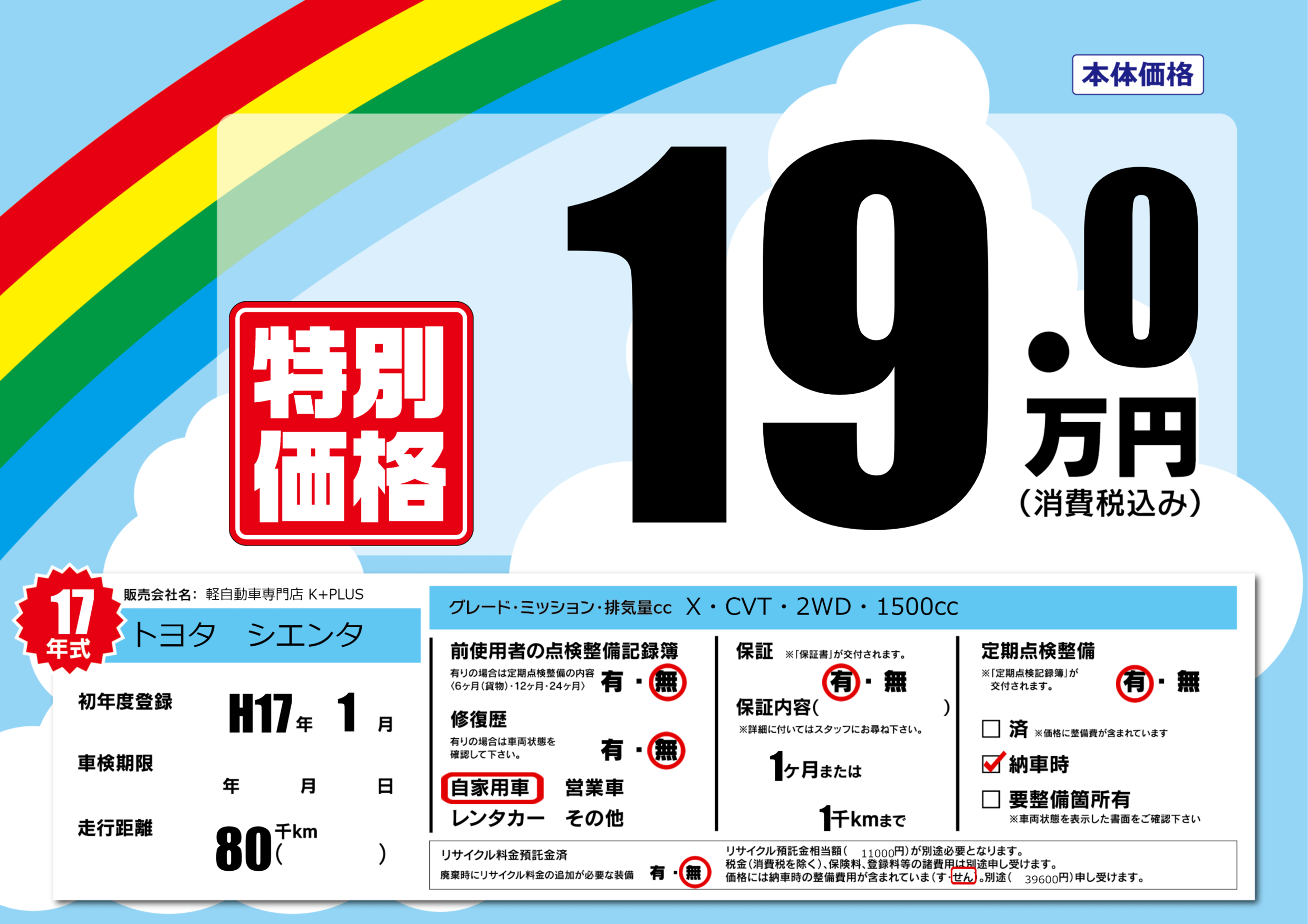 | 走行キロ | 8万km | 初年度登録 | H17年1月 |