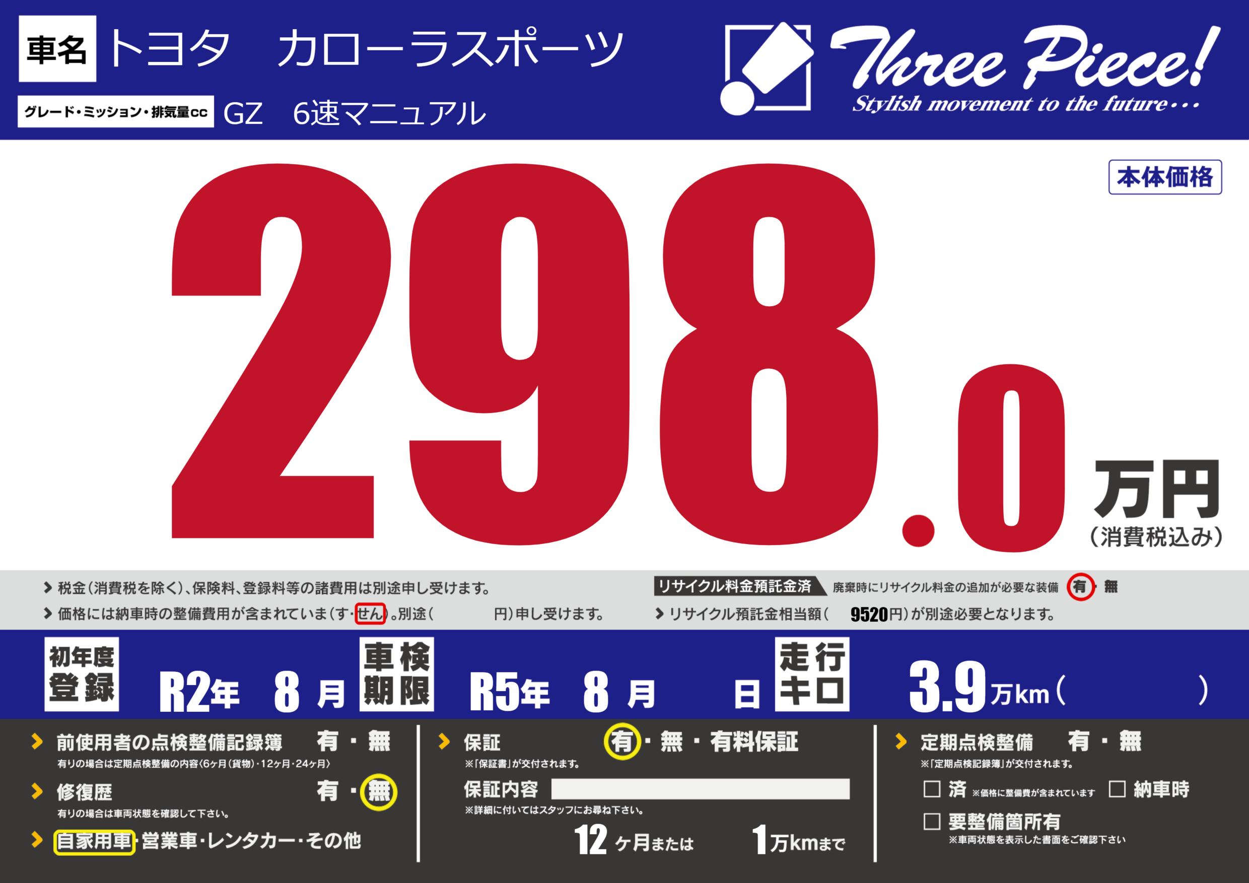 | 走行キロ | 0.3万km | 初年度登録 | R2年8月 |