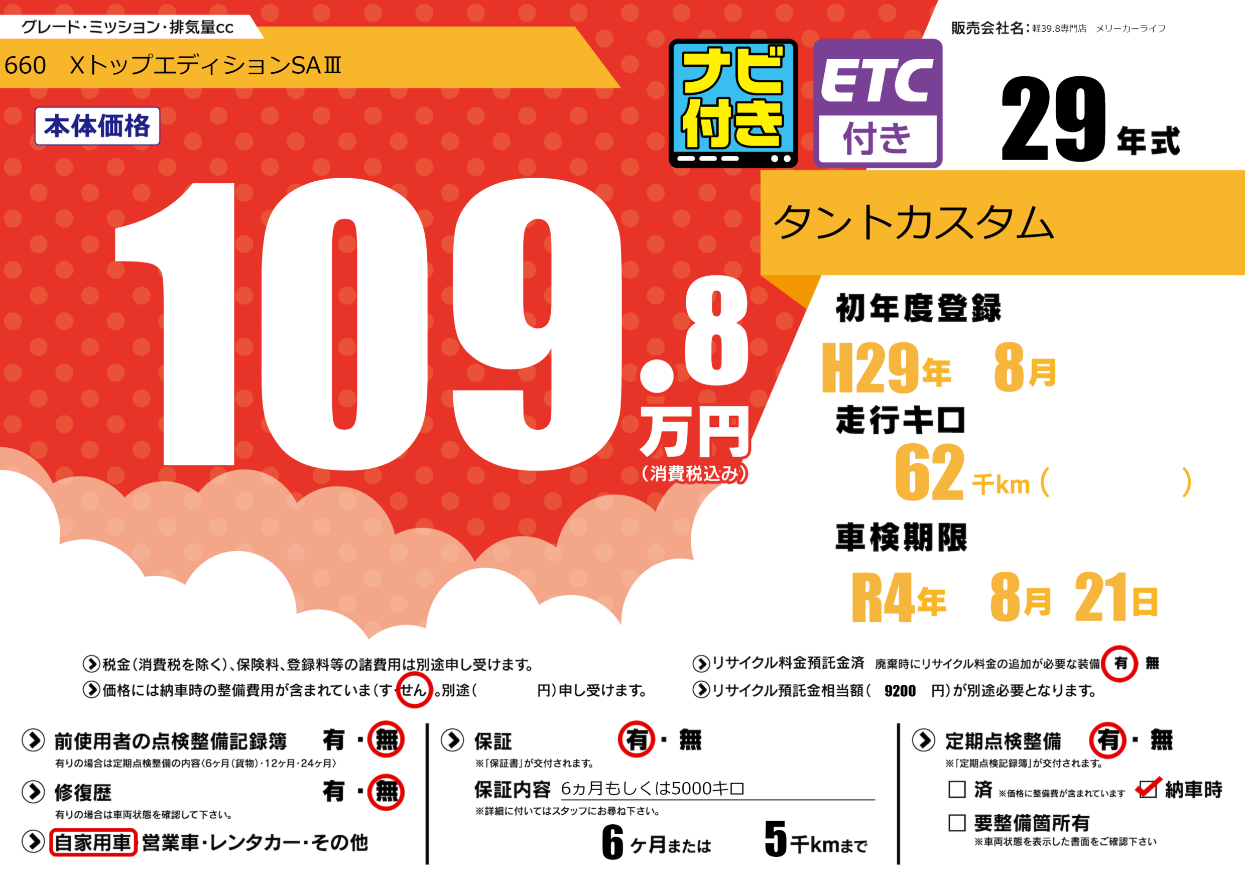 | 車名 | タントカスタム | グレード ミッション 排気量 |