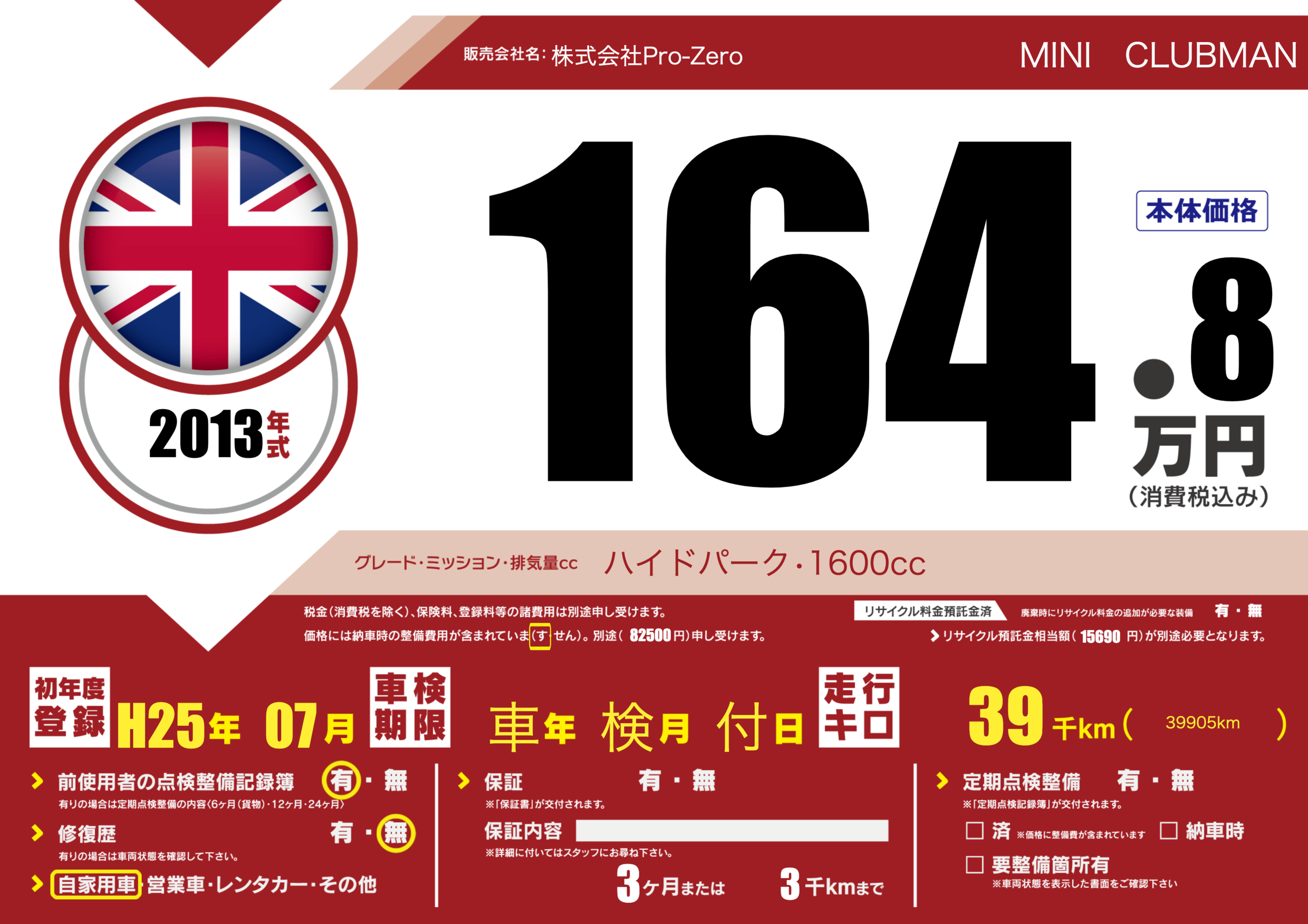 | 車名 | MINI CLUBMAN | グレード ミッション 排気量 |