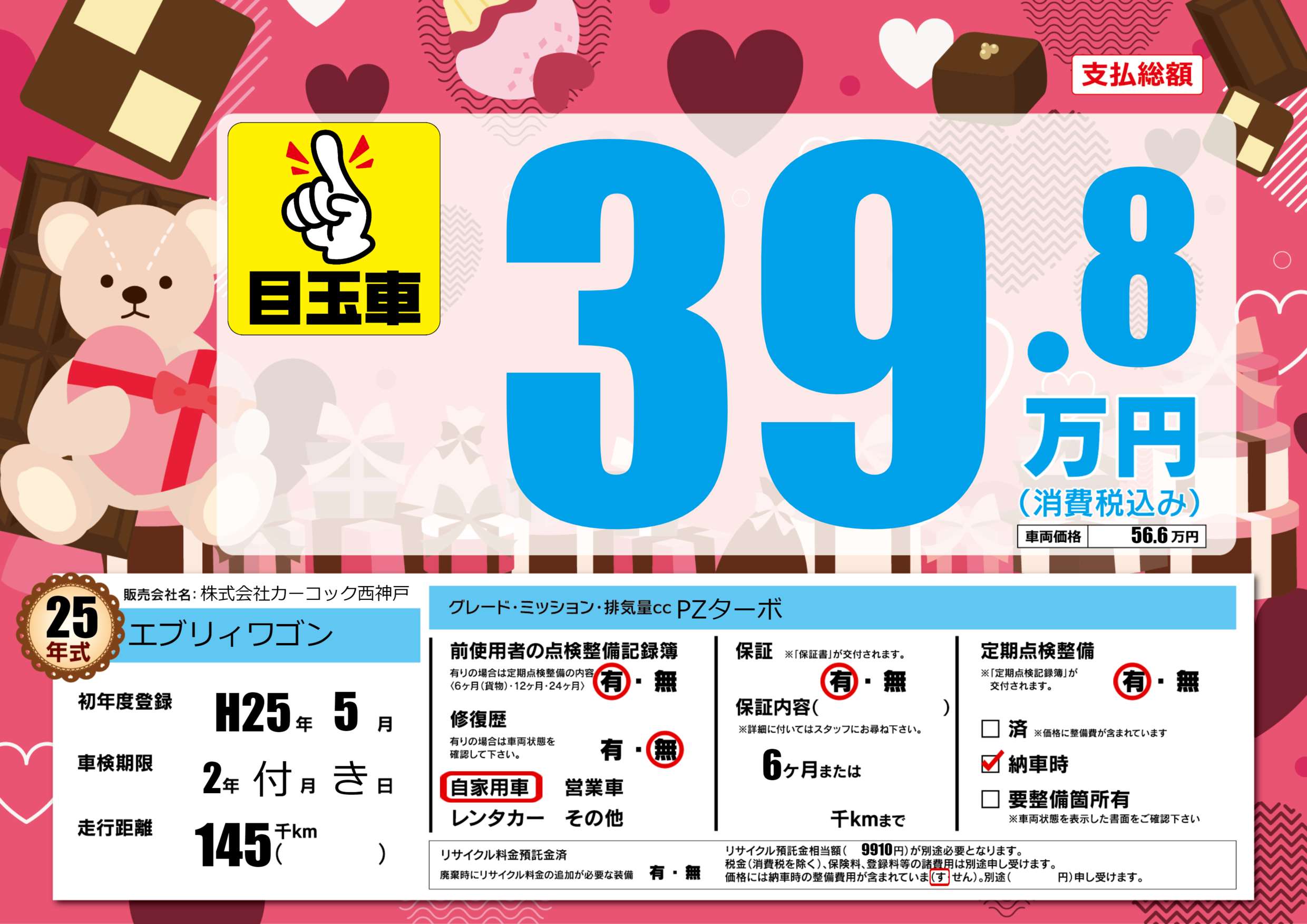 | 走行キロ | 14.5万km | 初年度登録 | H25年5月 |