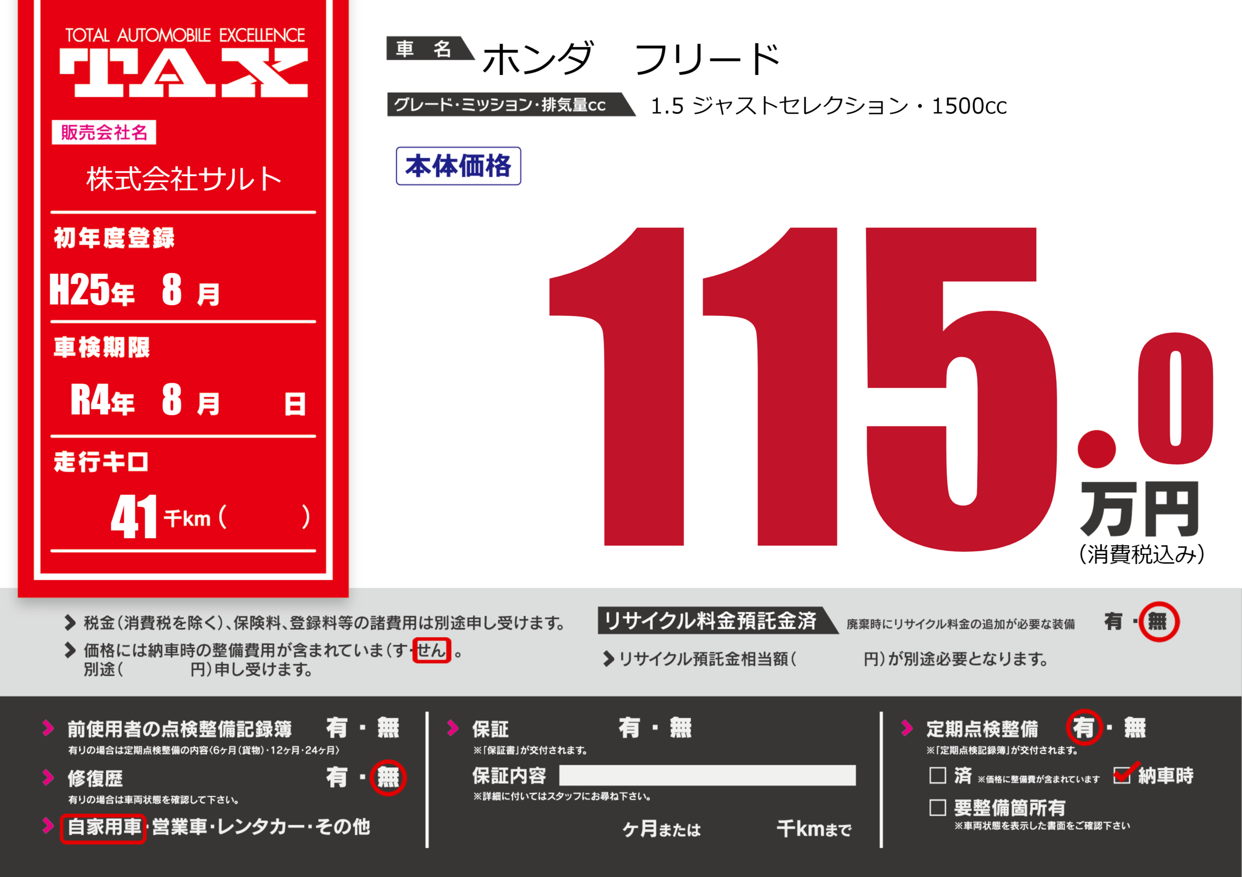 | 車名 | ホンダ フリード | グレード ミッション 排気量 |