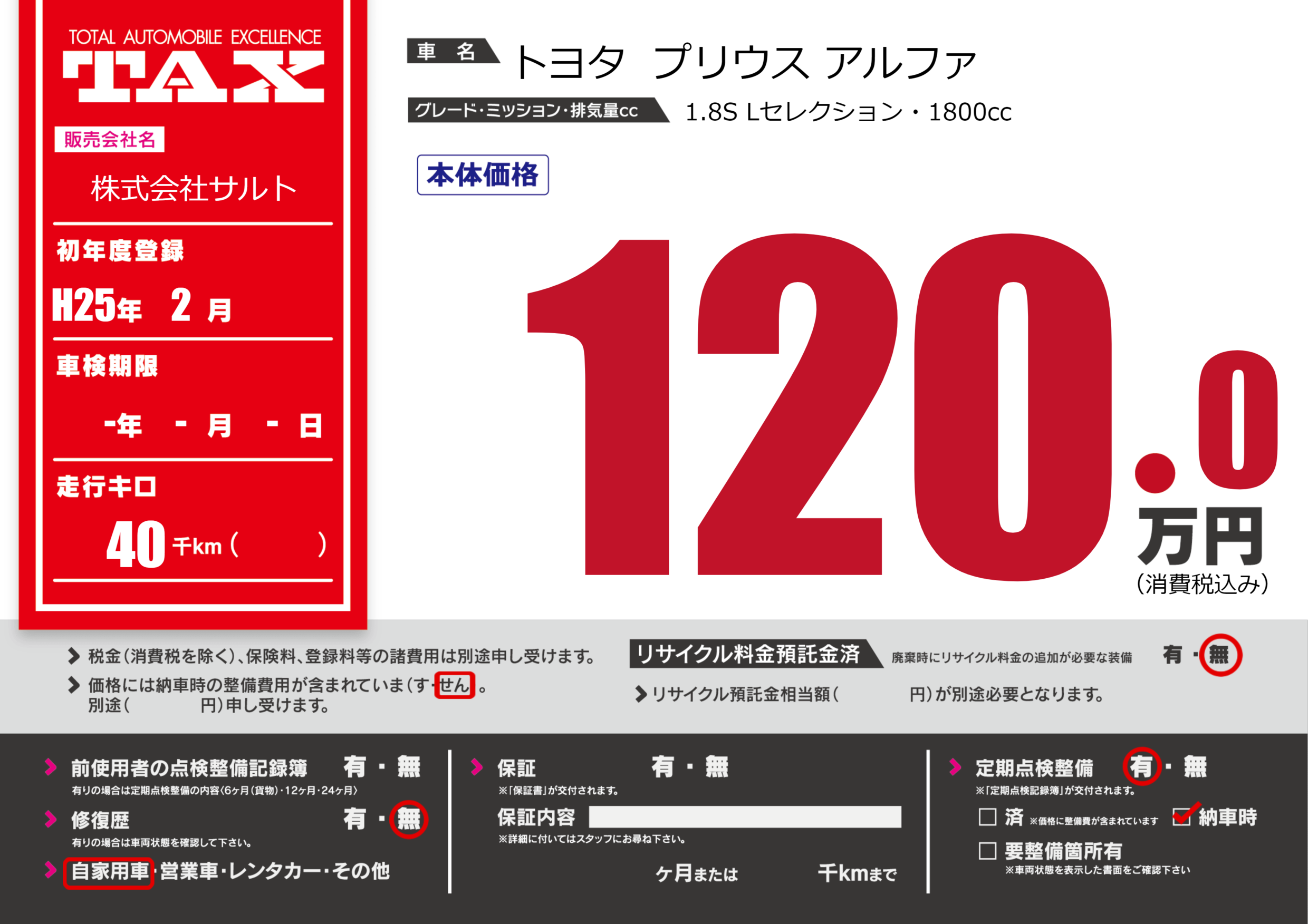 | 車検制限 | -年 -月 -日 | ||