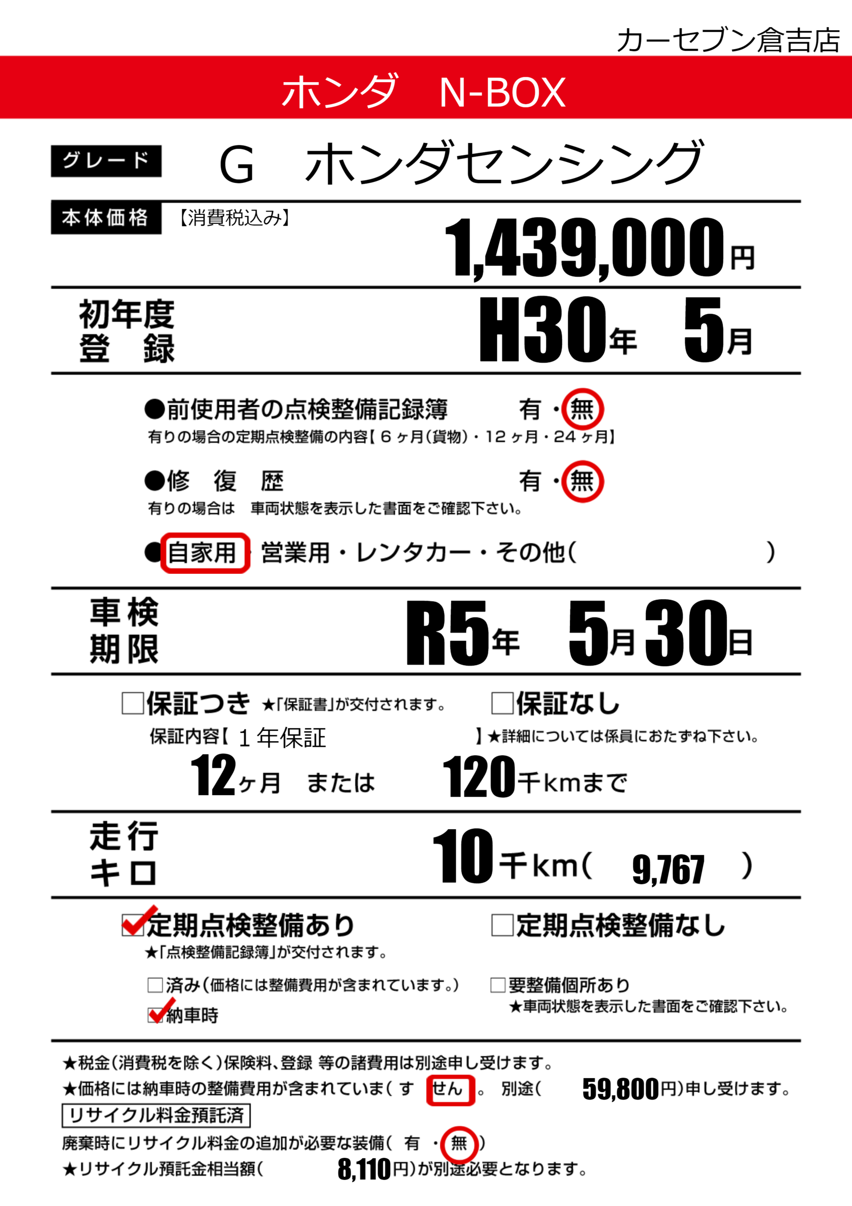 | 走行キロ | 1万km | 初年度登録 | H30年5月 |