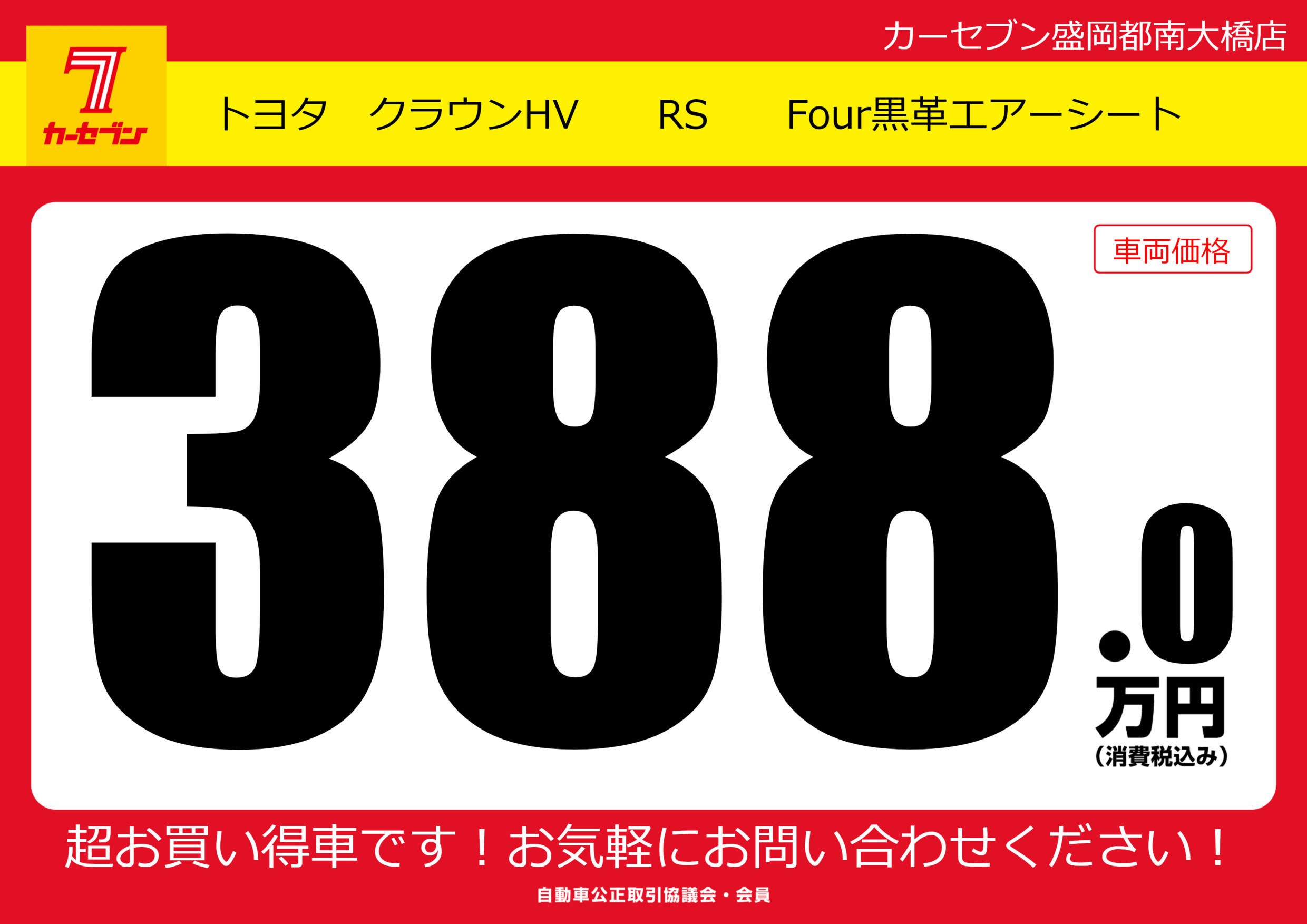 | 車名 | トヨタ クラウンHV RS Four黒革エアーシート | グレード ミッション 排気量 |
