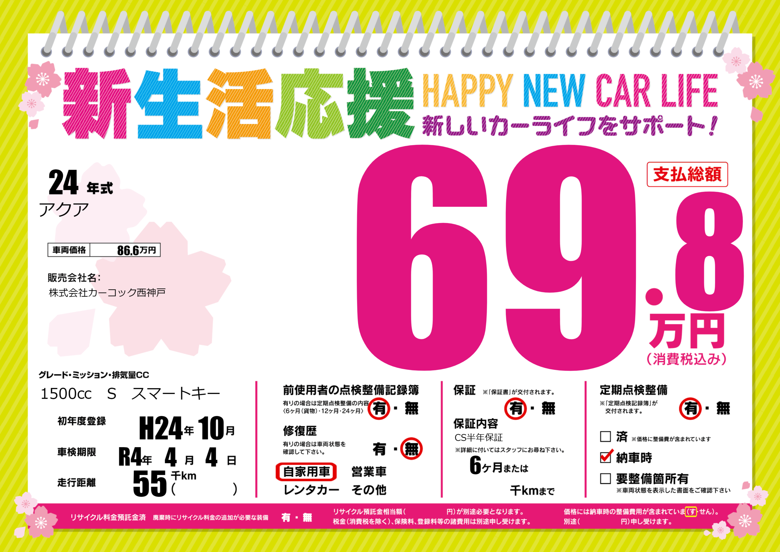 | 定期点検整備 | 定期点検整備あり 納車時あり | ||