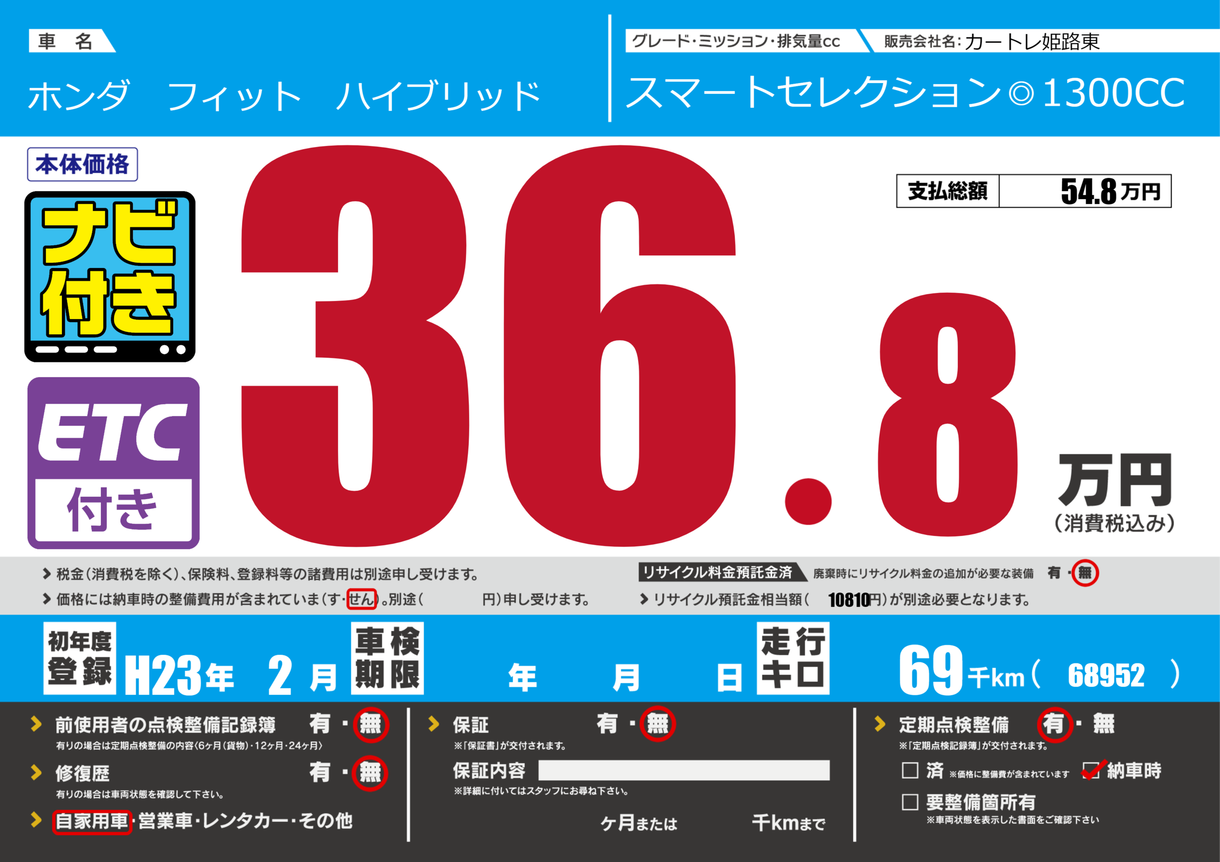 | 走行キロ | 6.9万km | 初年度登録 | H23年2月 |