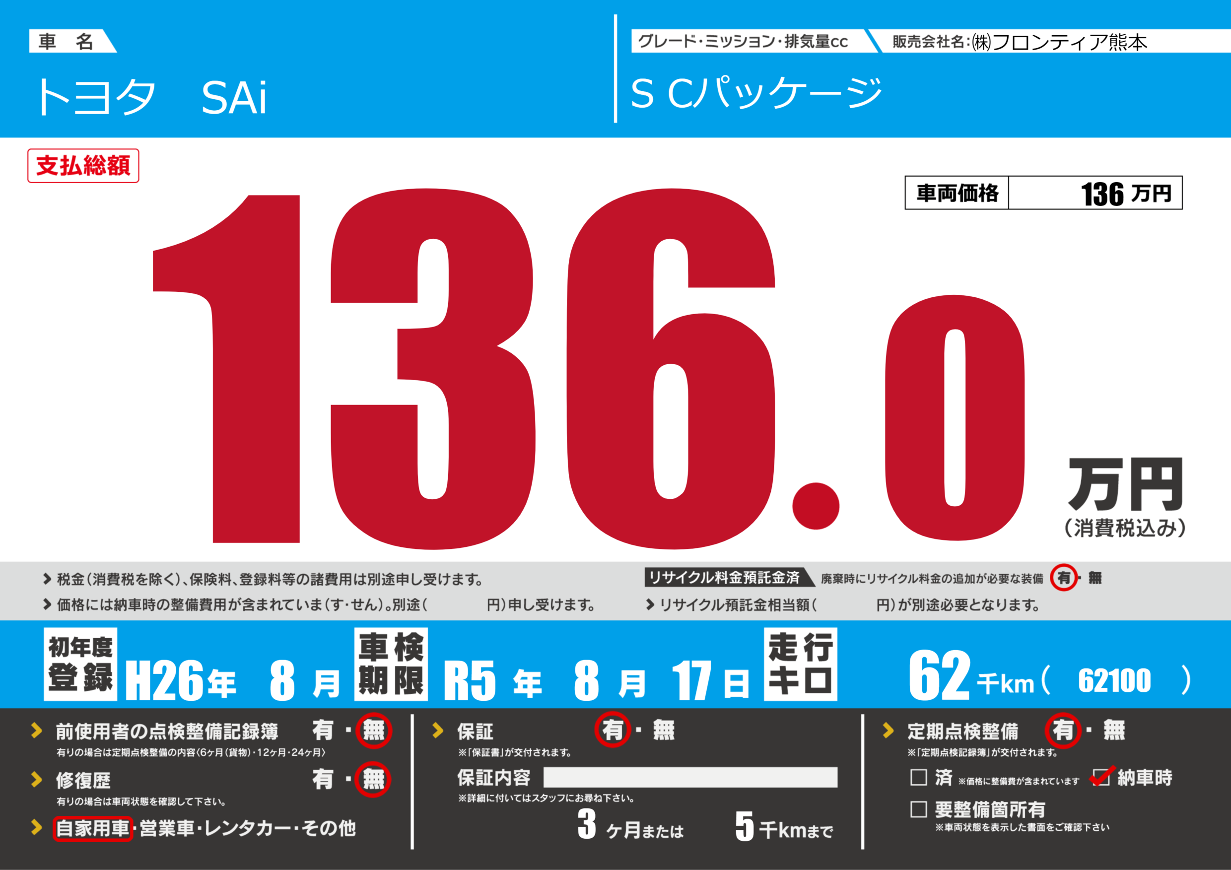| 車名 | トヨタ SAi | グレード ミッション 排気量 |