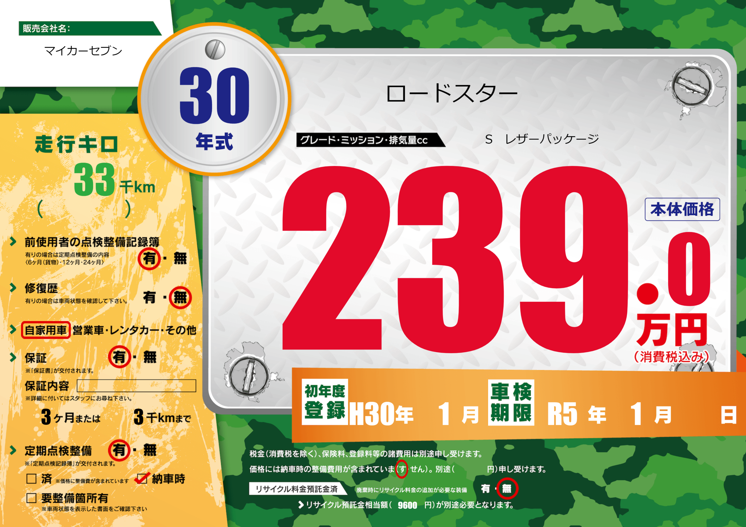 | 走行キロ | 3.3万km | 初年度登録 | H30年1月 |