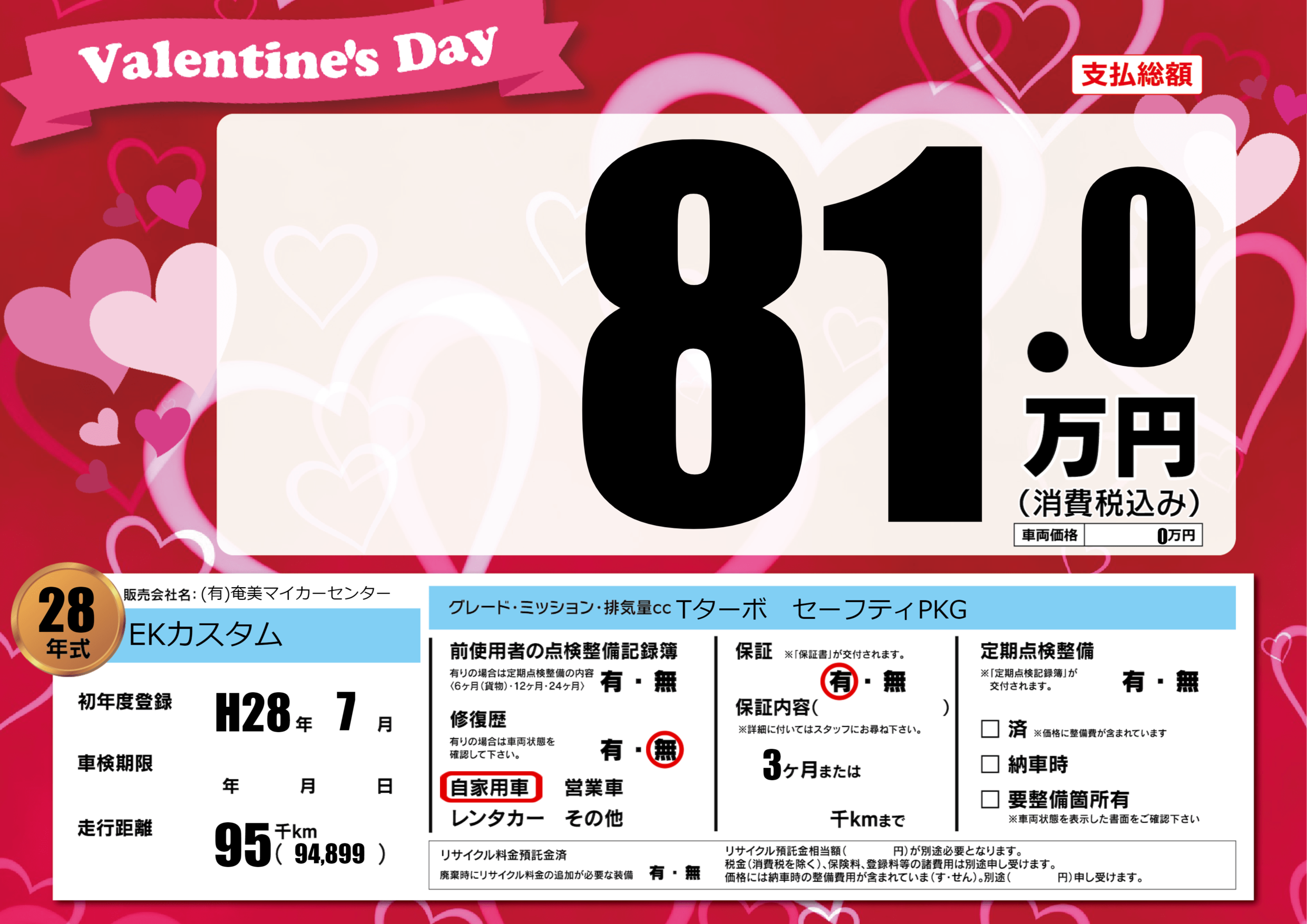 保証付き 保証内容(---) 3ヶ月または()千kmまで |