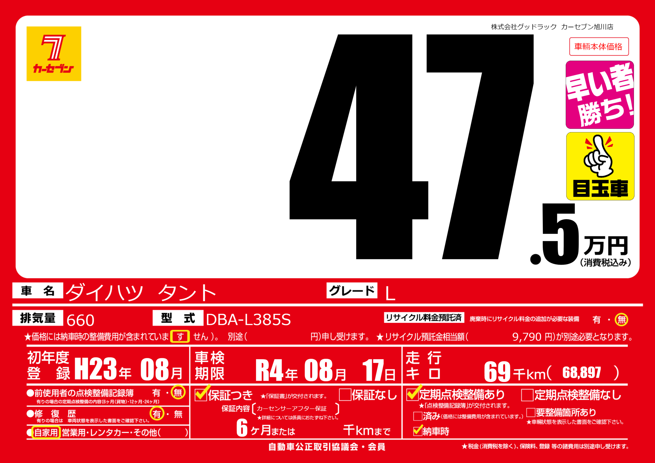 | 車名 | ダイハツ タント | グレード ミッション 排気量 |