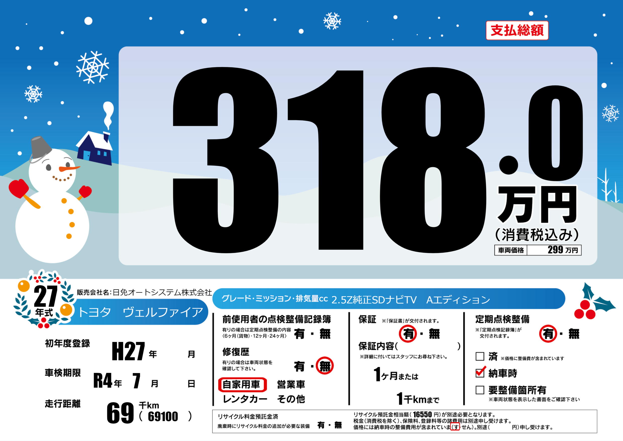 | 定期点検整備 | 定期点検整備あり 納車時あり | ||