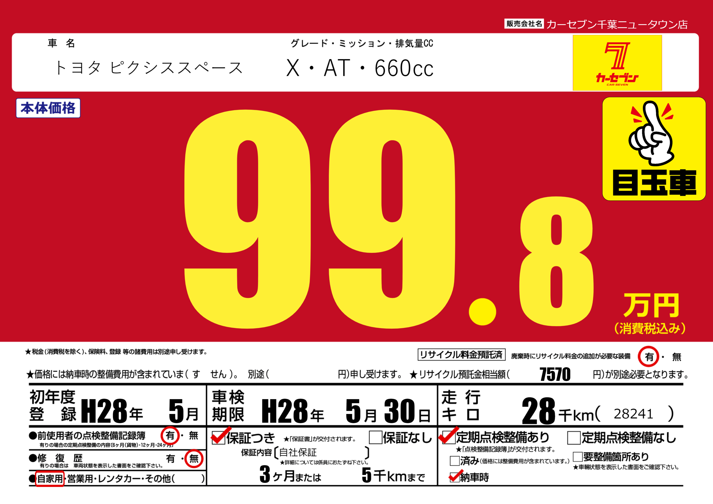 | 車名 | トヨタ ピクシススペース | グレード ミッション 排気量 |