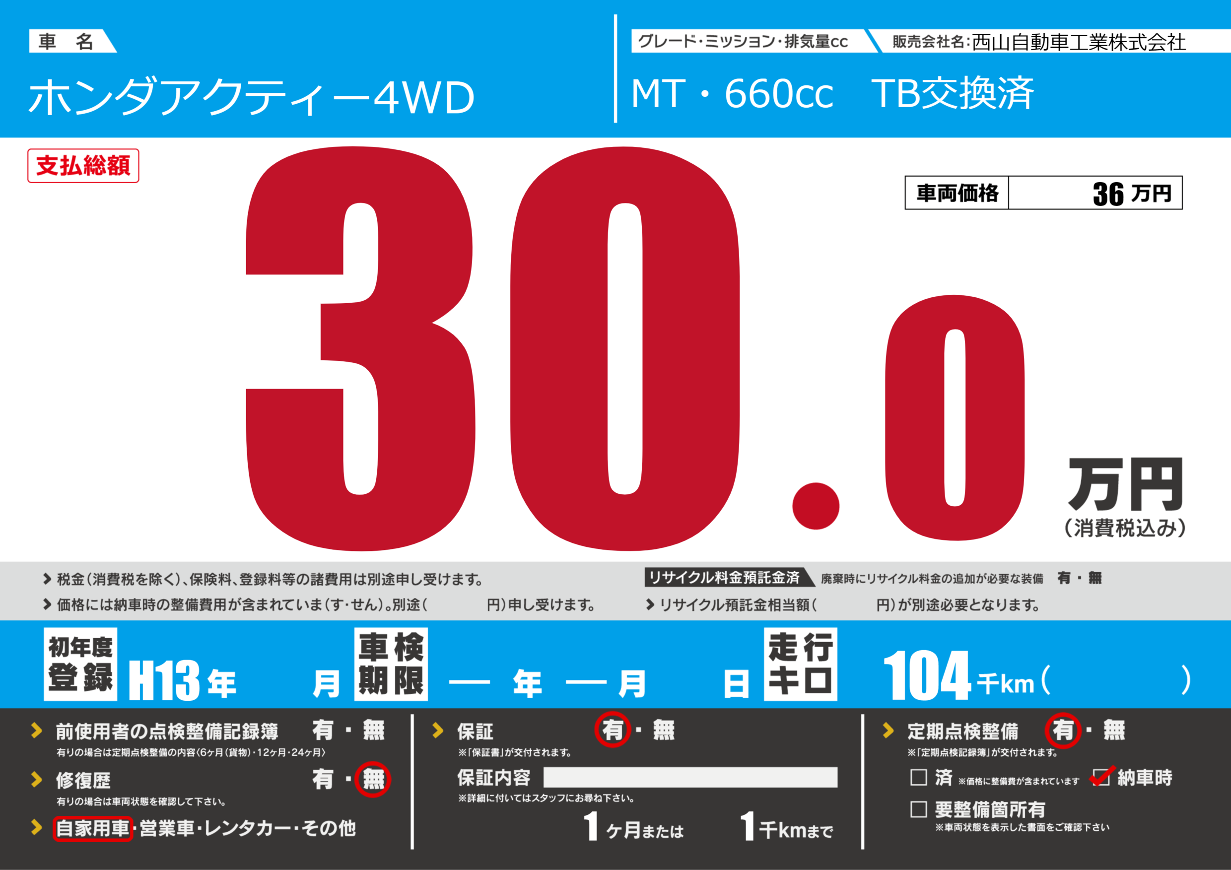 | 定期点検整備 | 定期点検整備あり 納車時あり | ||