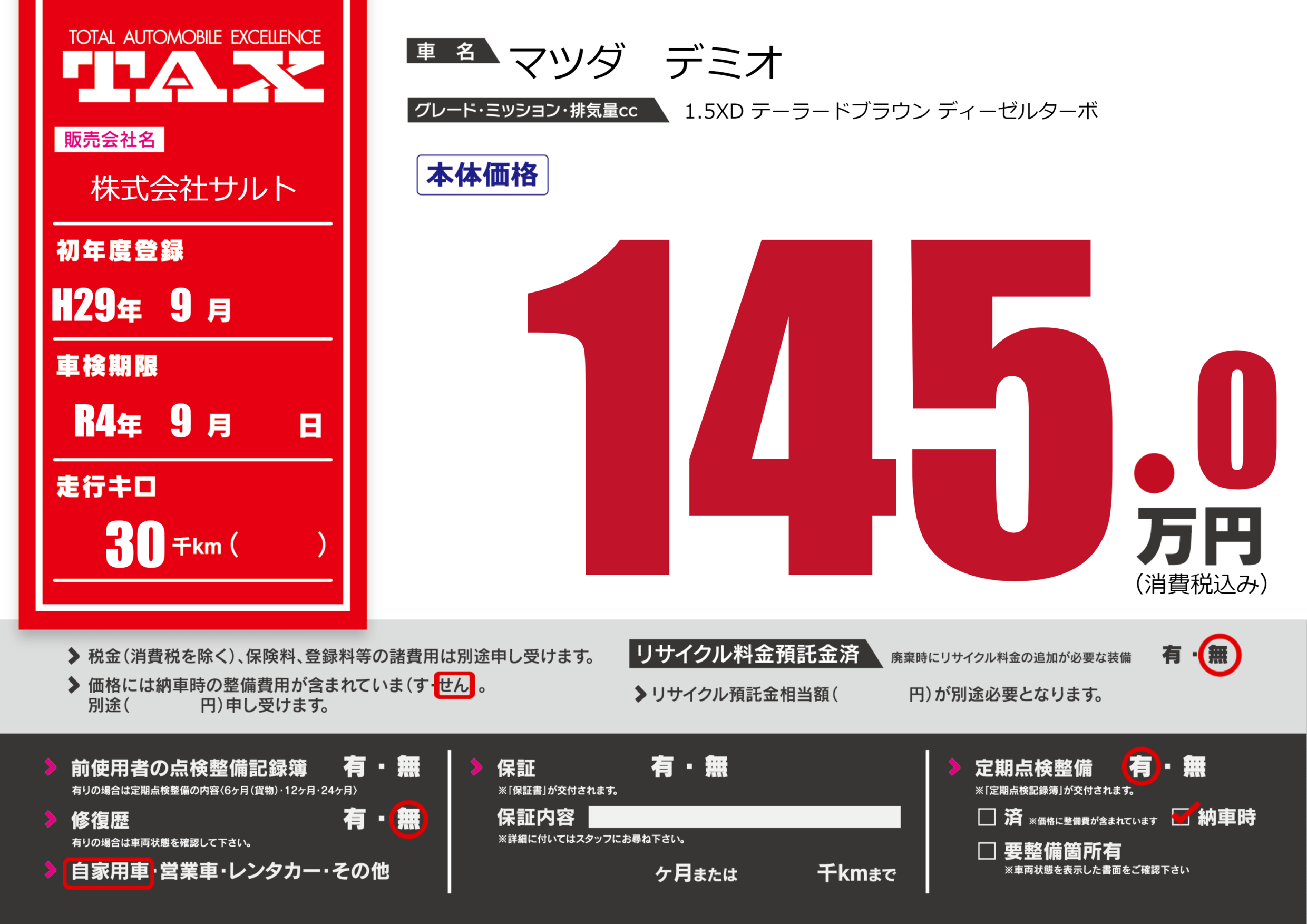 | 走行キロ | 3万km | 初年度登録 | H29年9月 |