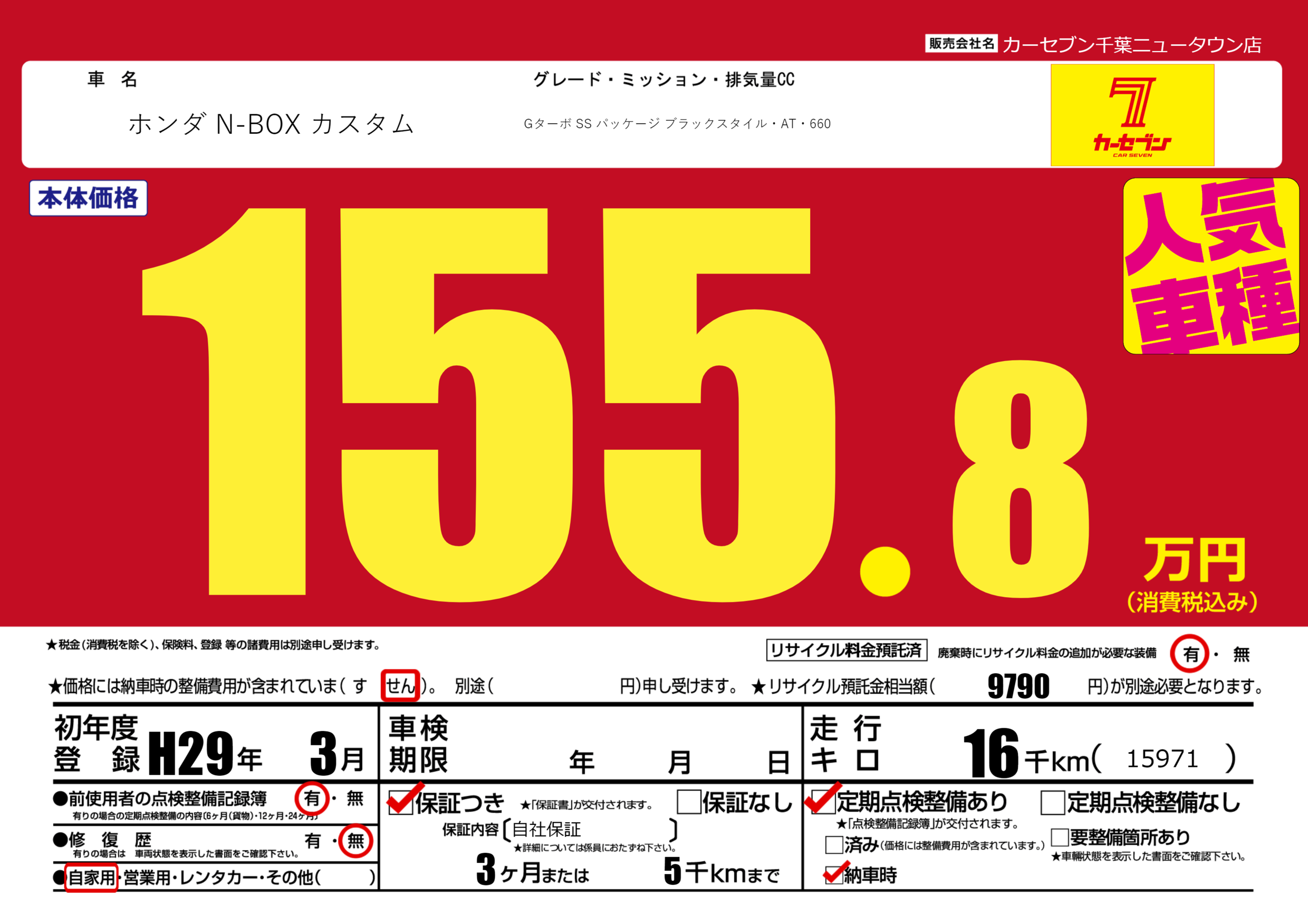 | 車名 | ホンダ N-BOX カスタム | グレード ミッション 排気量 |