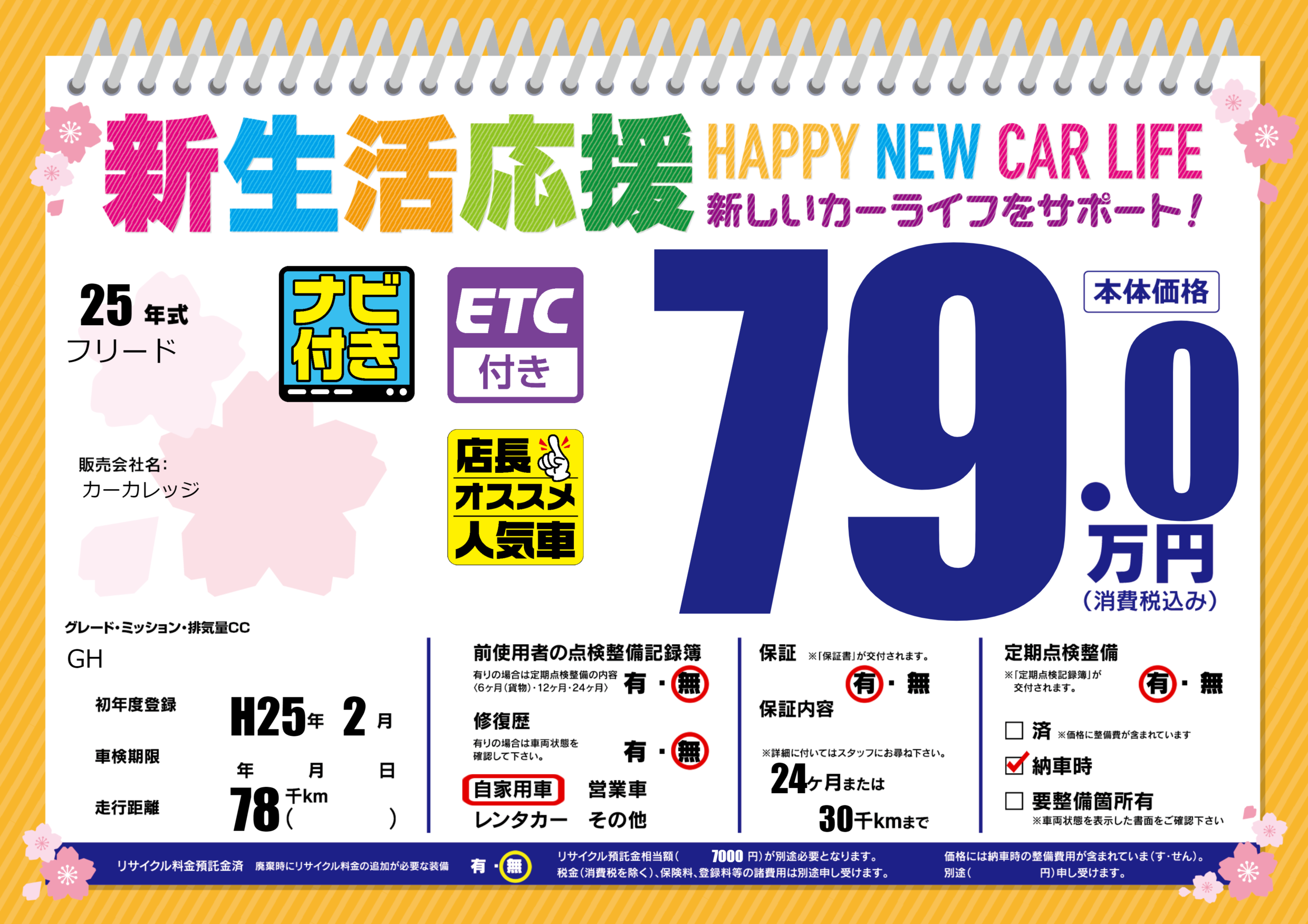 | 定期点検整備 | 定期点検整備あり 納車時あり | ||