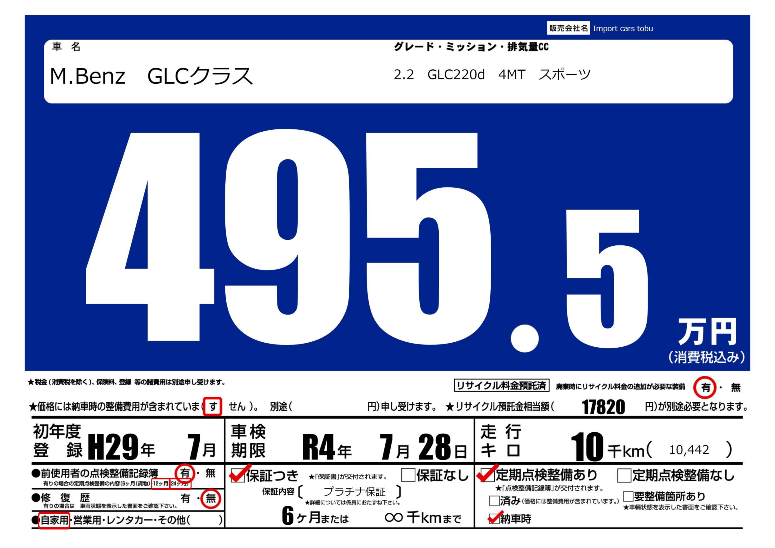 | 車名 | M.Benz GLCクラス | グレード ミッション 排気量 |