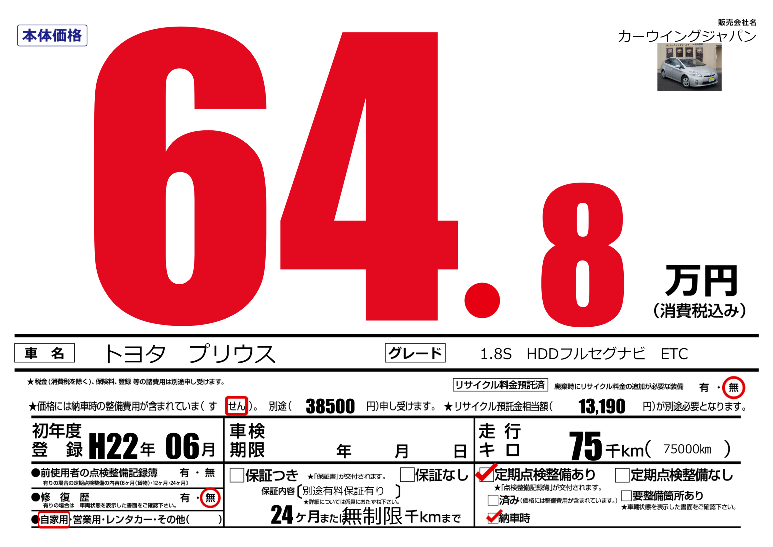 | 車名 | トヨタ プリウス | グレード ミッション 排気量 |