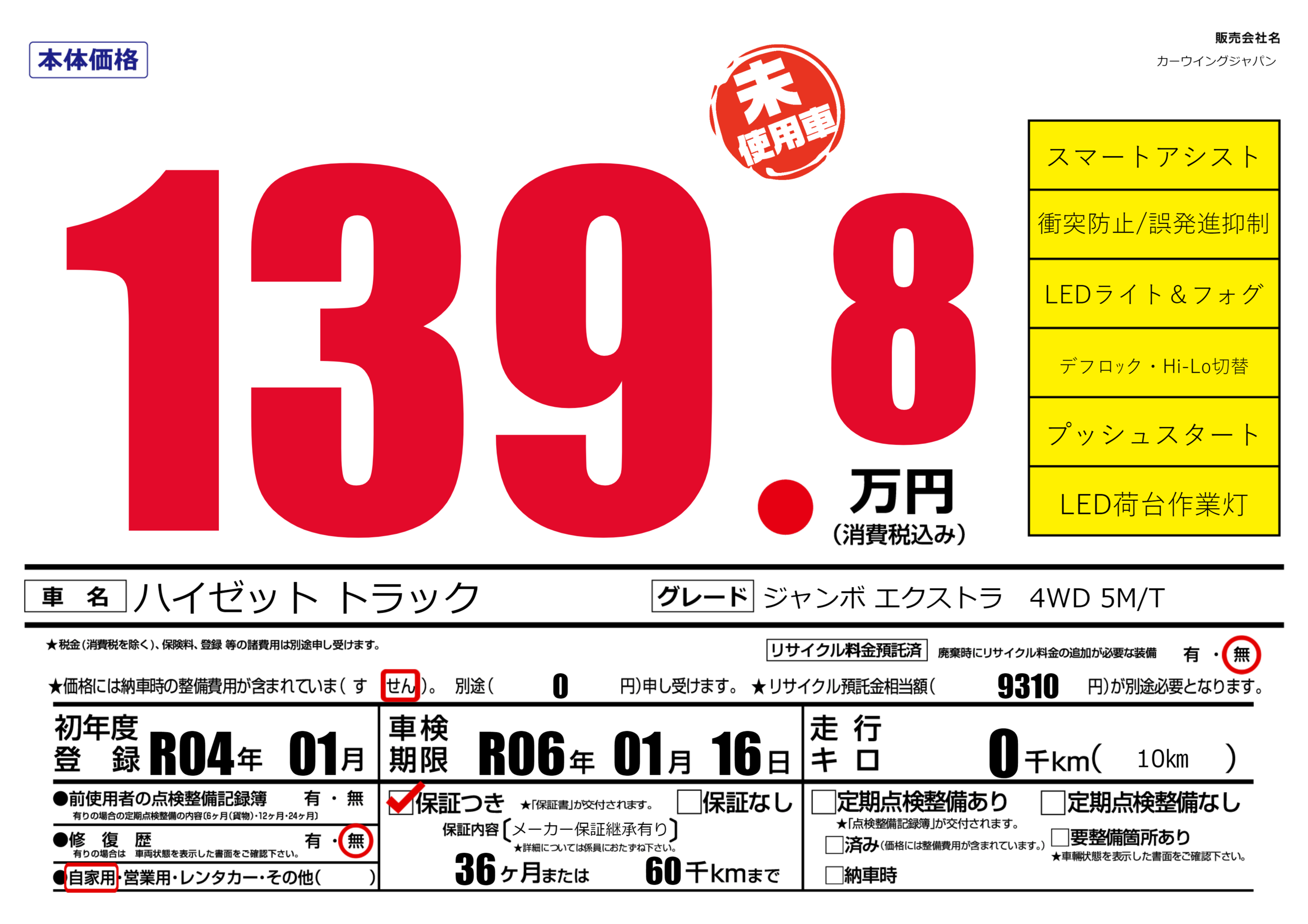 | 車名 | ハイゼット トラック | グレード ミッション 排気量 |