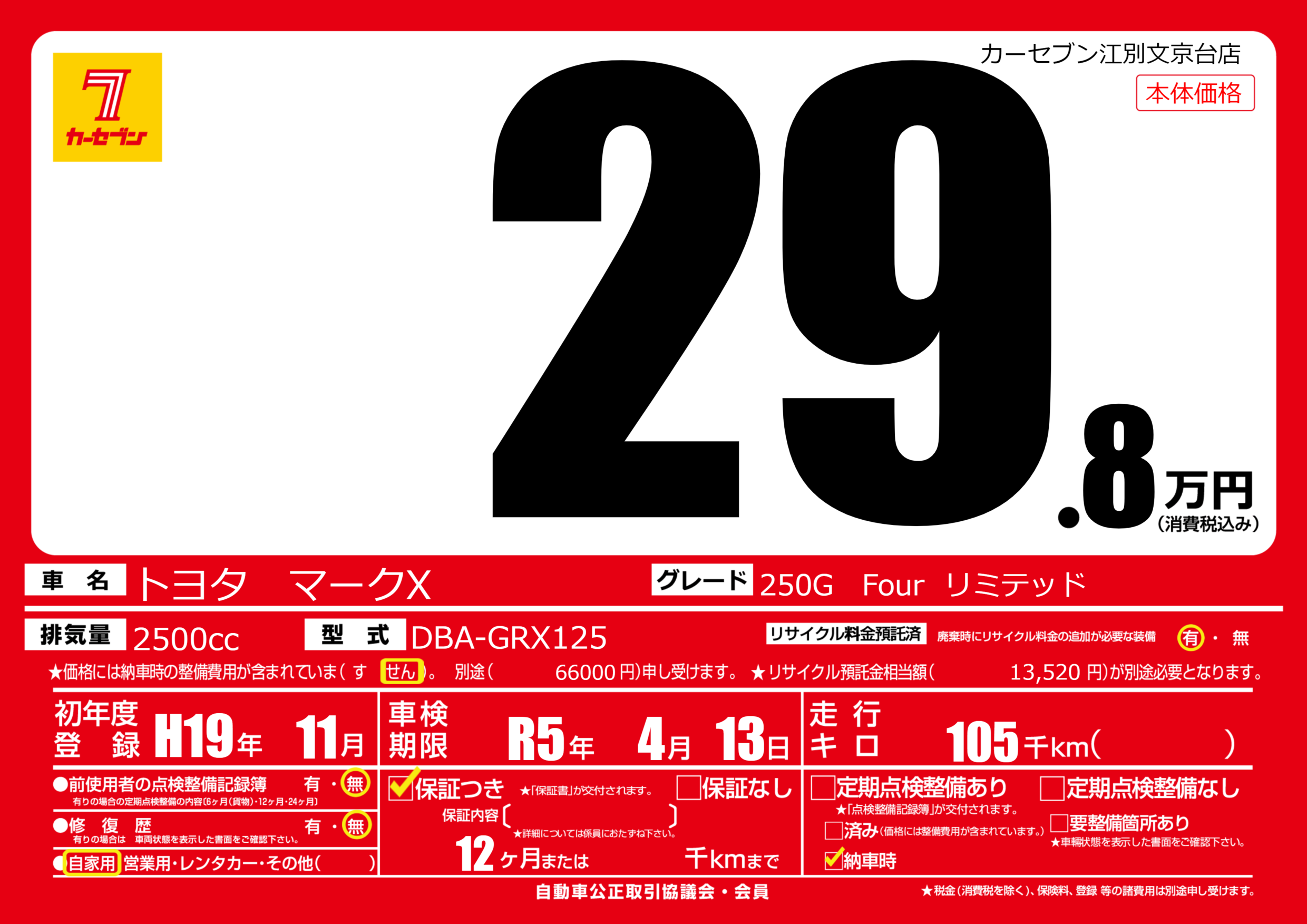 | 車名 | トヨタ マークX | グレード ミッション 排気量 |