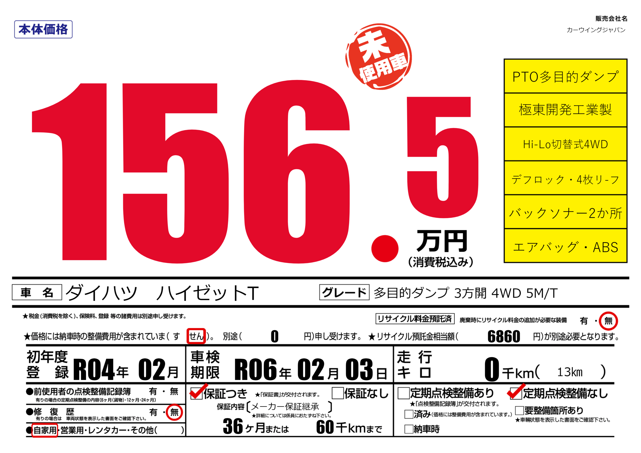 | 車名 | ダイハツ ハイゼットT | グレード ミッション 排気量 |