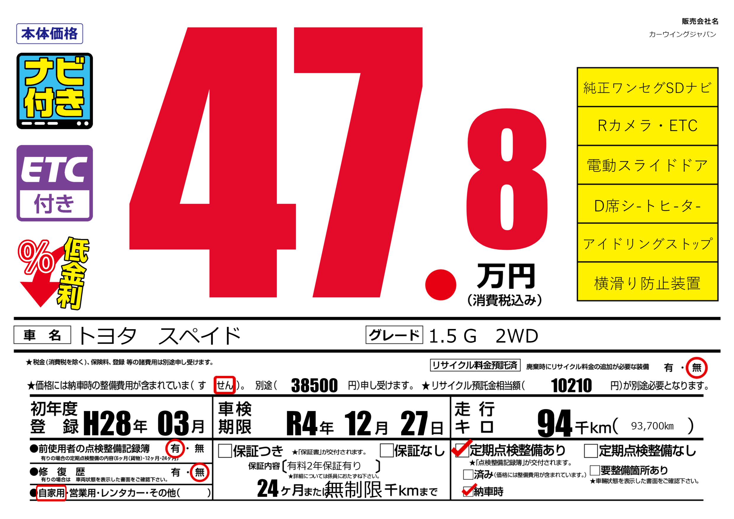 | 車名 | トヨタ スペイド | グレード ミッション 排気量 |