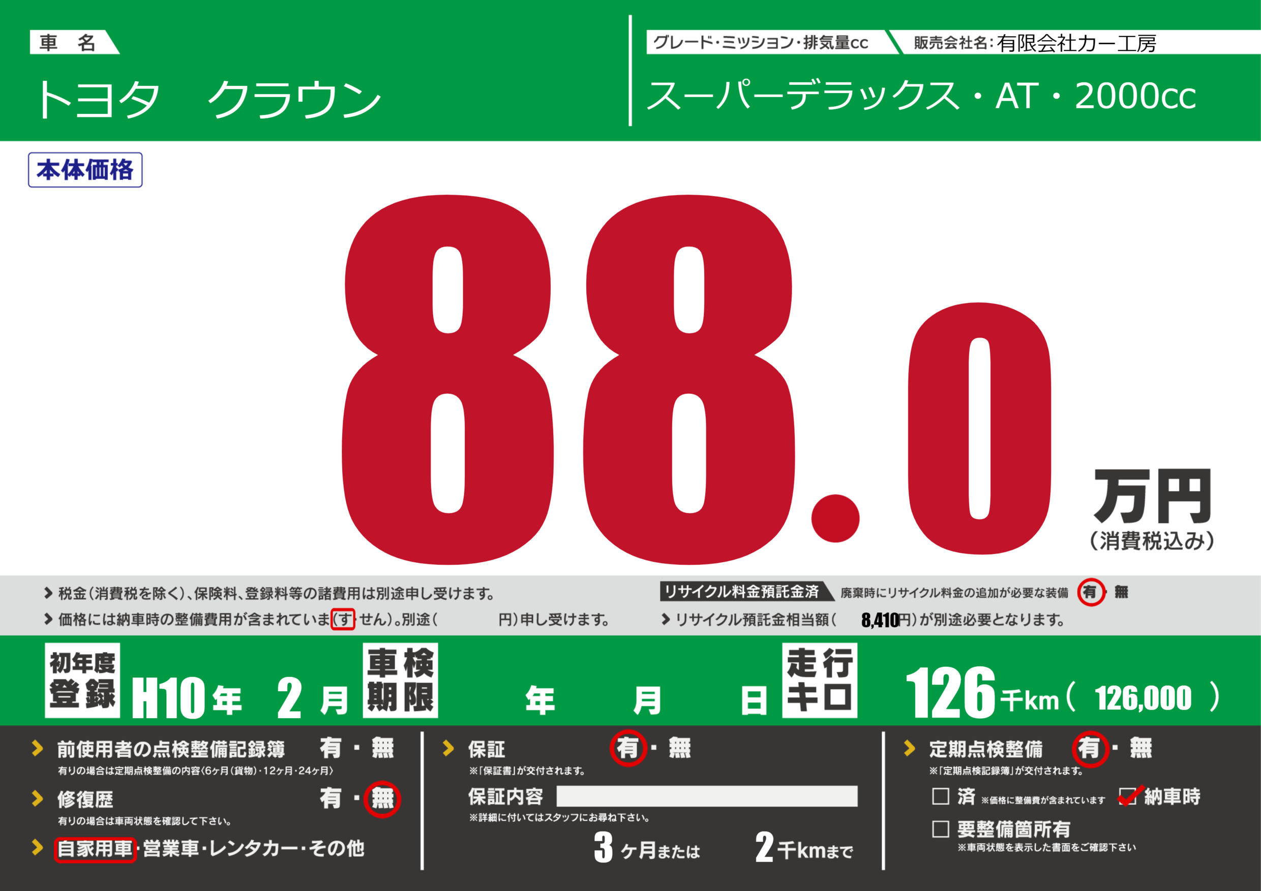 保証付き 保証内容(---) 3ヶ月または(2)千kmまで |