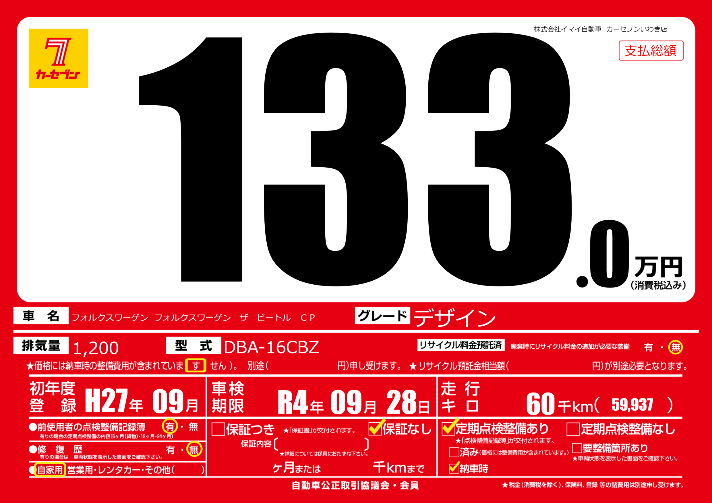 | 車名 | フォルクスワーゲン フォルクスワーゲン ザ ビートル CP | グレード ミッション 排気量 |