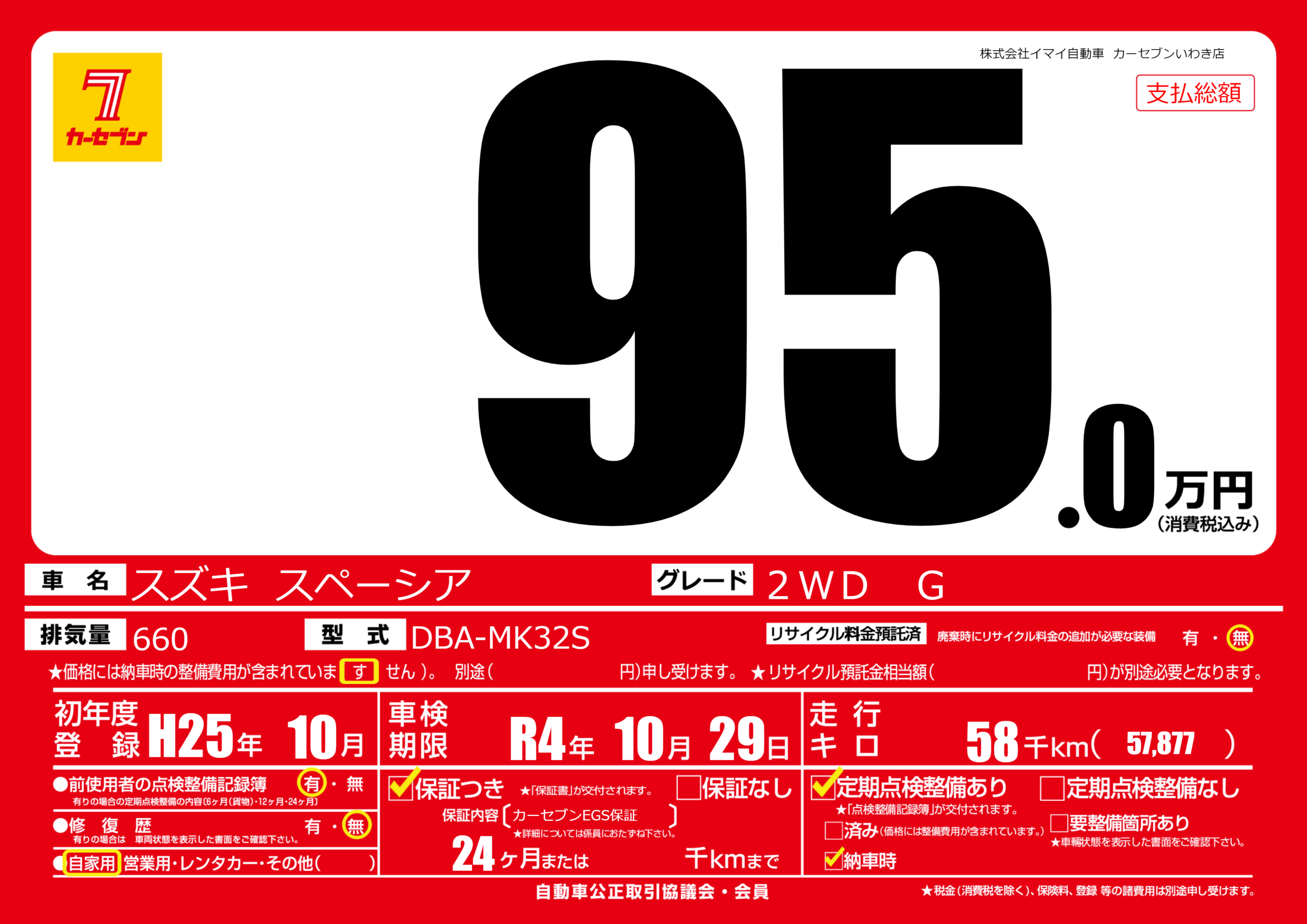 | 車名 | スズキ スペーシア | グレード ミッション 排気量 |
