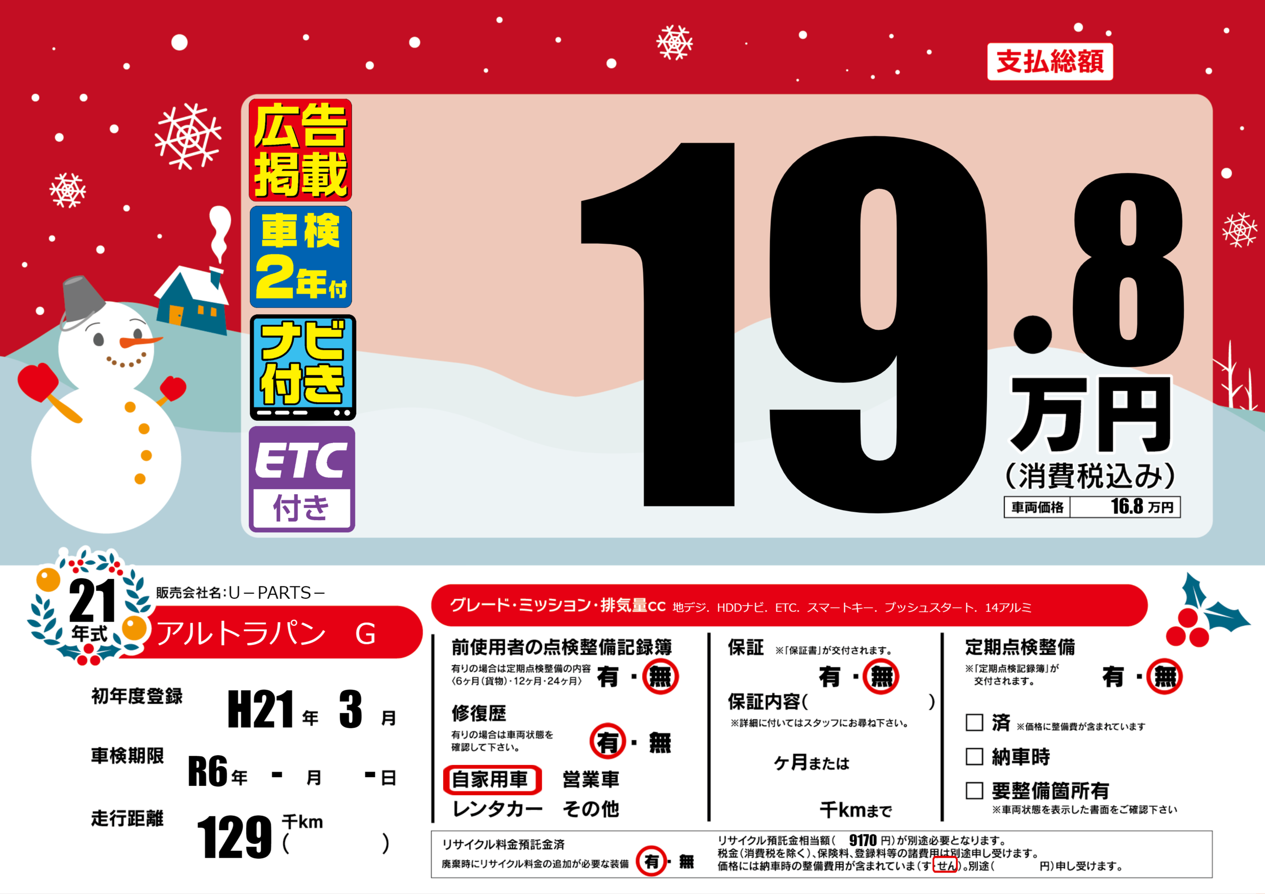 | 走行キロ | 12.9万km | 初年度登録 | H21年3月 |