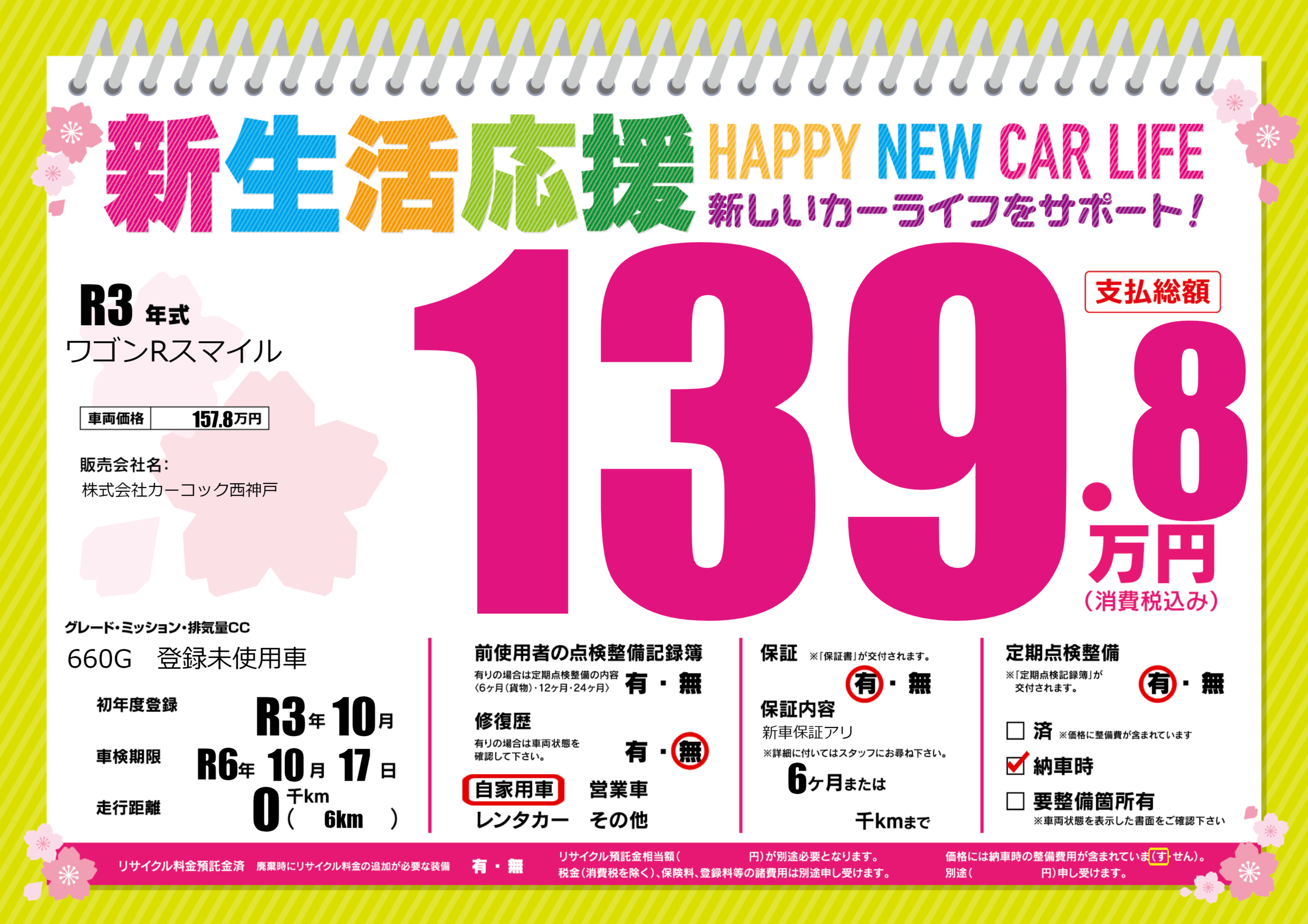 保証付き 保証内容(新車保証アリ) 6ヶ月または千km |