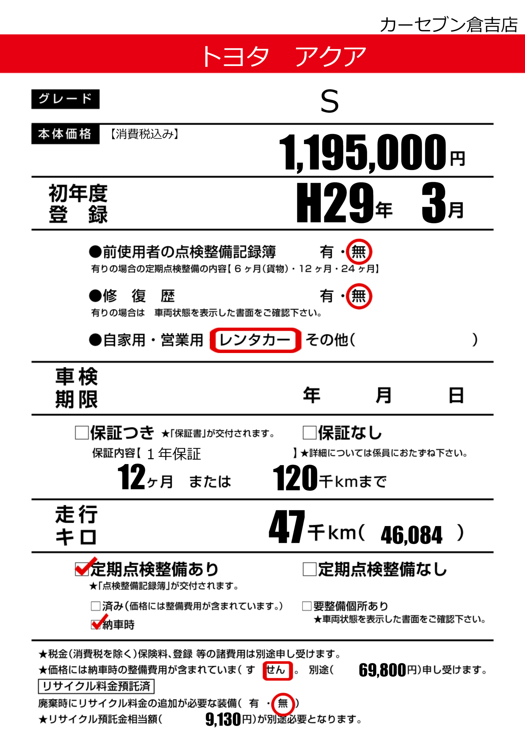 | 車名 | トヨタ アクア | グレード ミッション 排気量 |