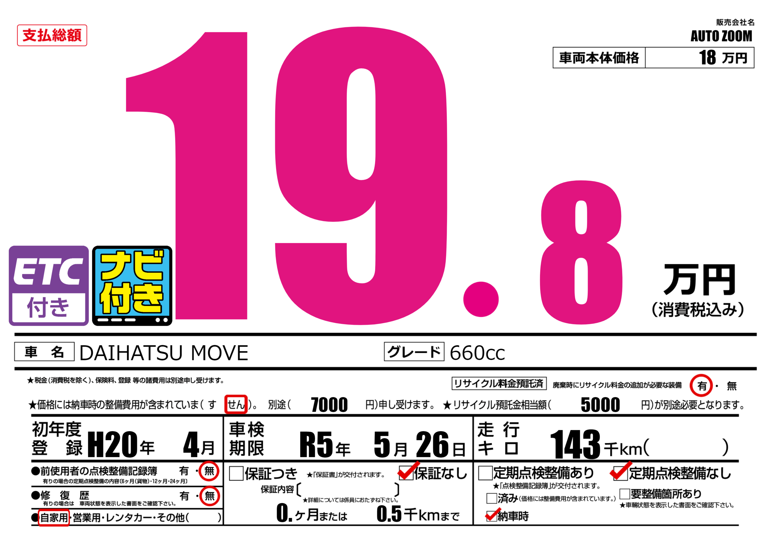 | 車名 | DAIHATSU MOVE | グレード ミッション 排気量 |