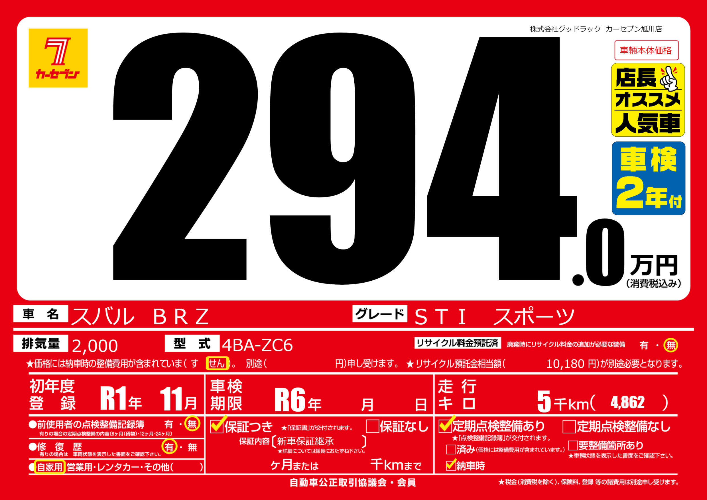 | 車名 | スバル BRZ | グレード ミッション 排気量 |
