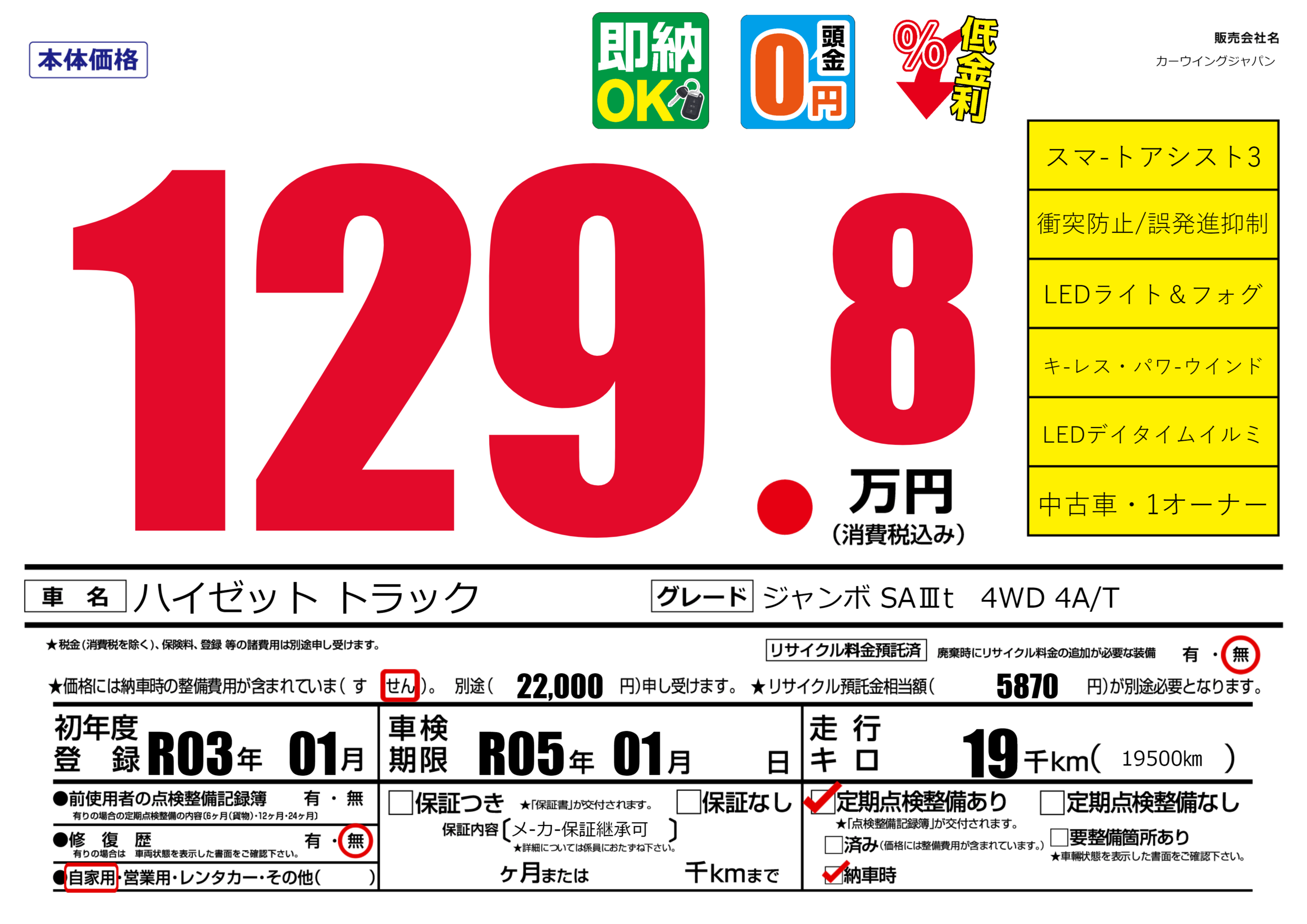 | 車名 | ハイゼット トラック | グレード ミッション 排気量 |