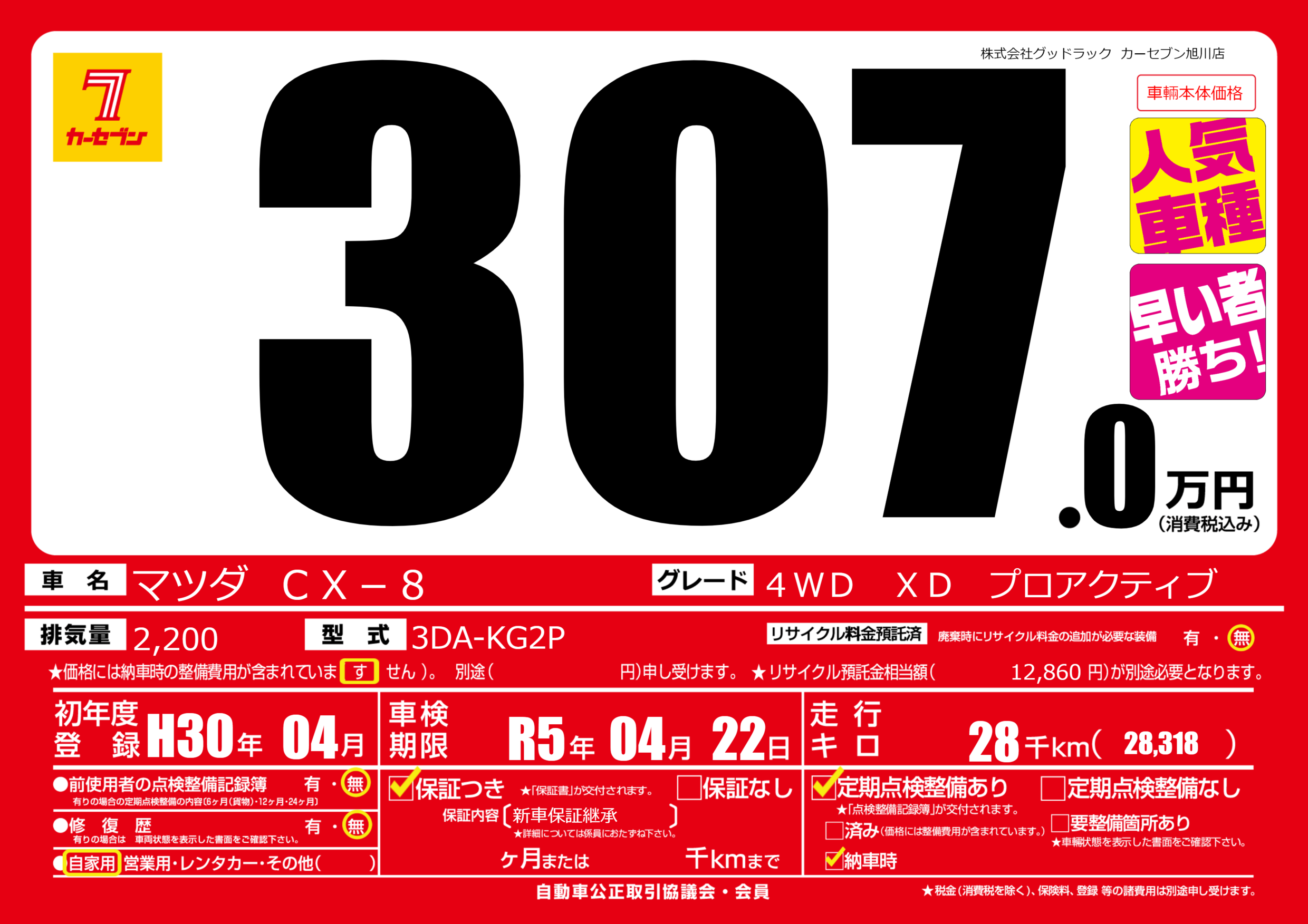 | 車名 | マツダ CX-8 | グレード ミッション 排気量 |