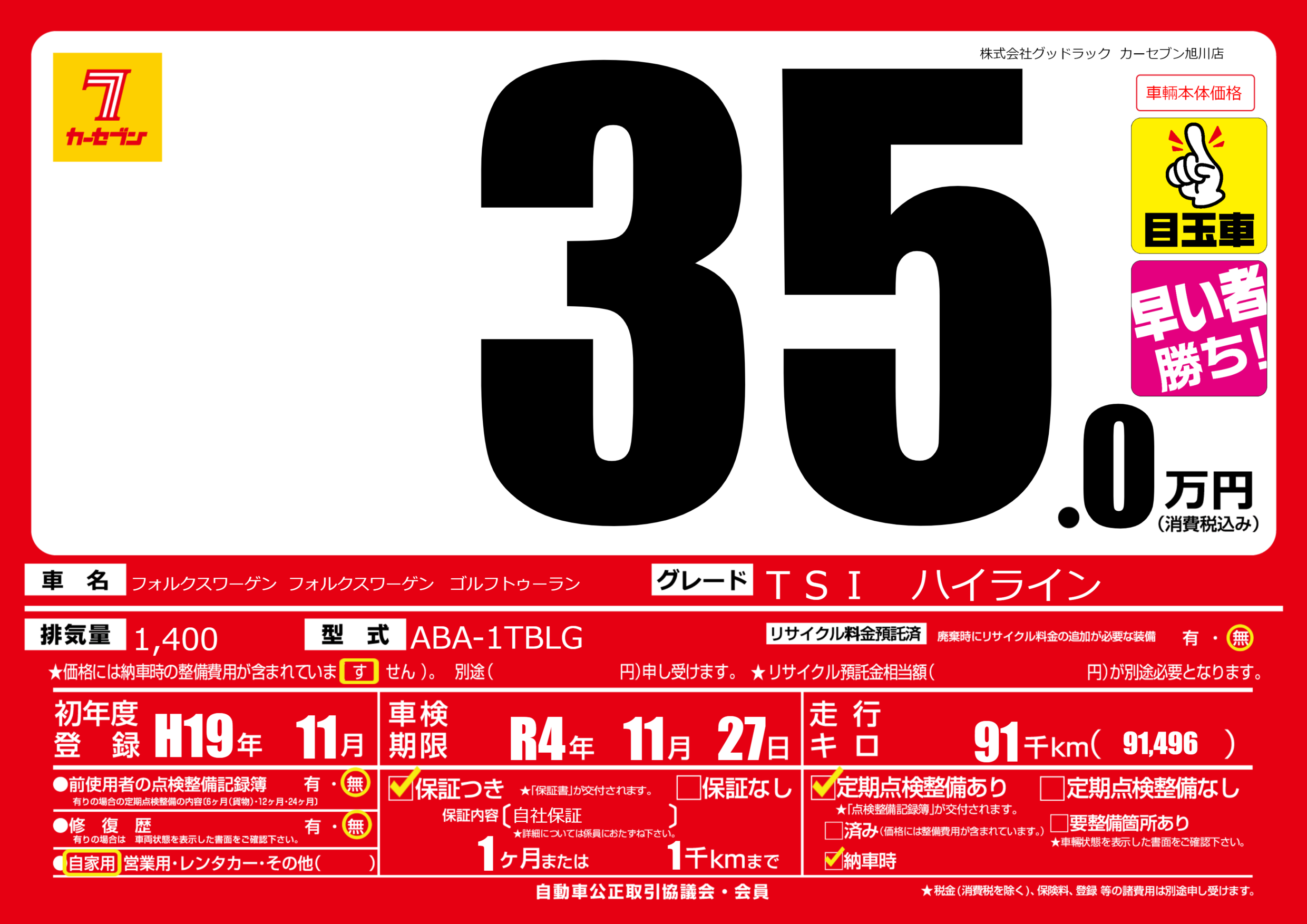 保証付き 保証内容(自社保証) 1ヶ月または(1)千kmまで |