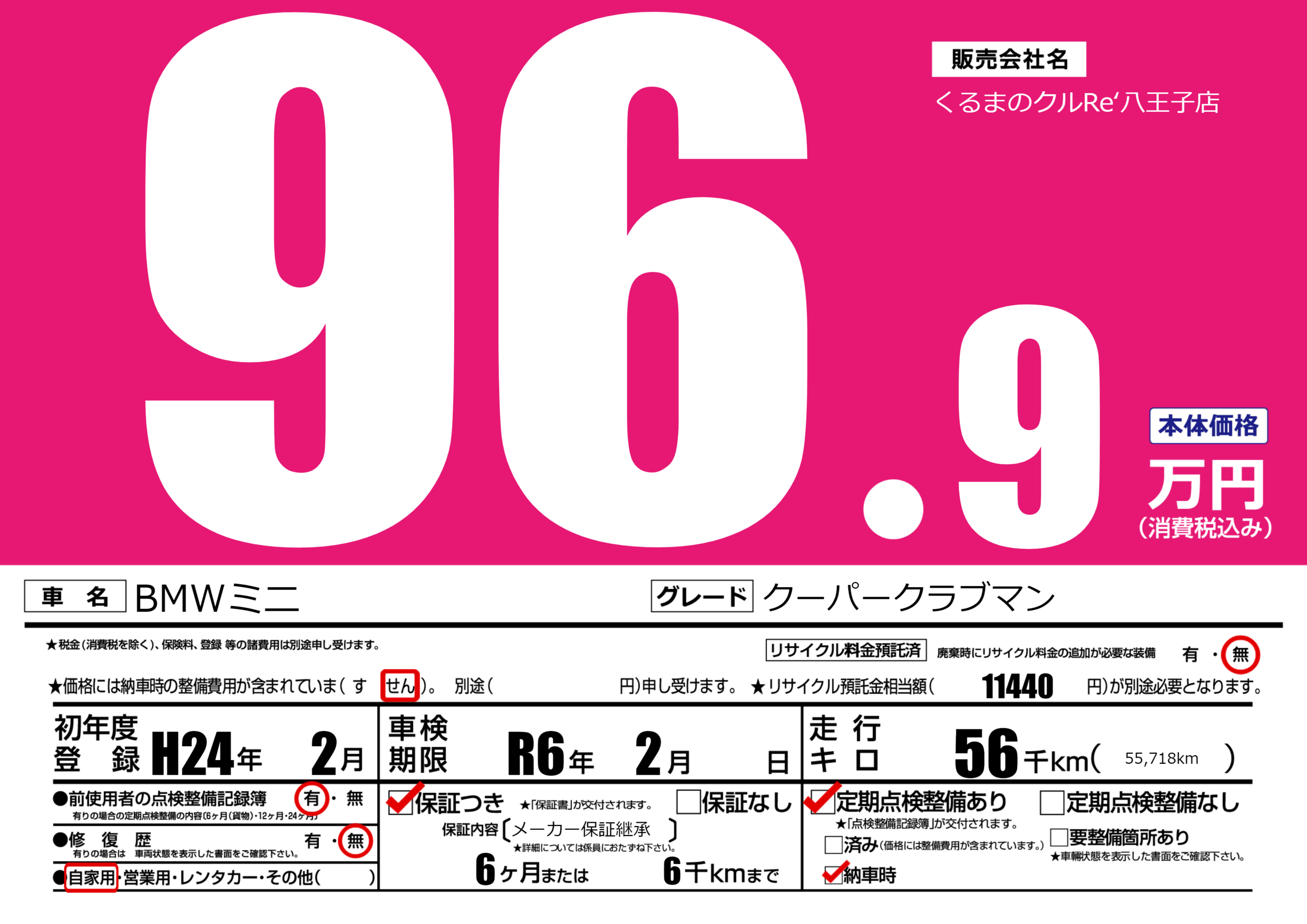 | 車名 | BMWミニ | グレード ミッション 排気量 |