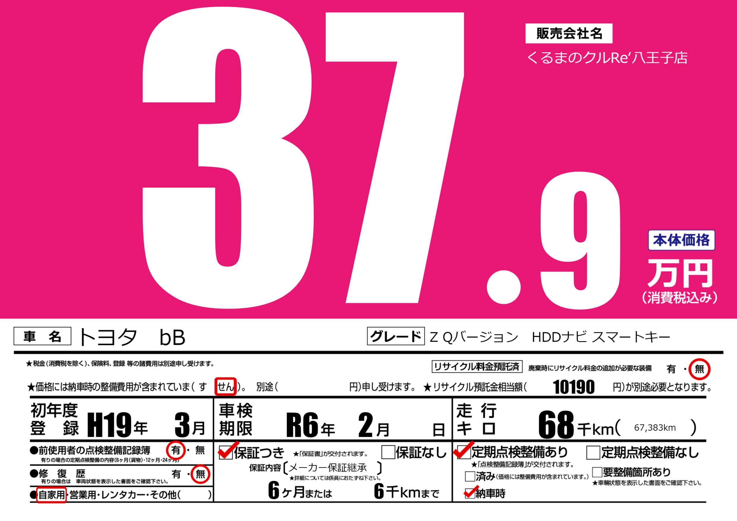 | 車名 | トヨタ bB | グレード ミッション 排気量 |