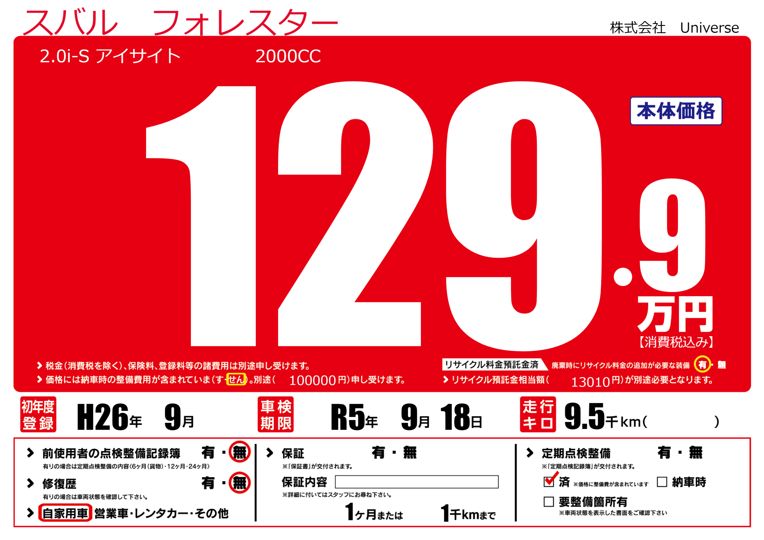| 車名 | スバル フォレスター | グレード ミッション 排気量 |