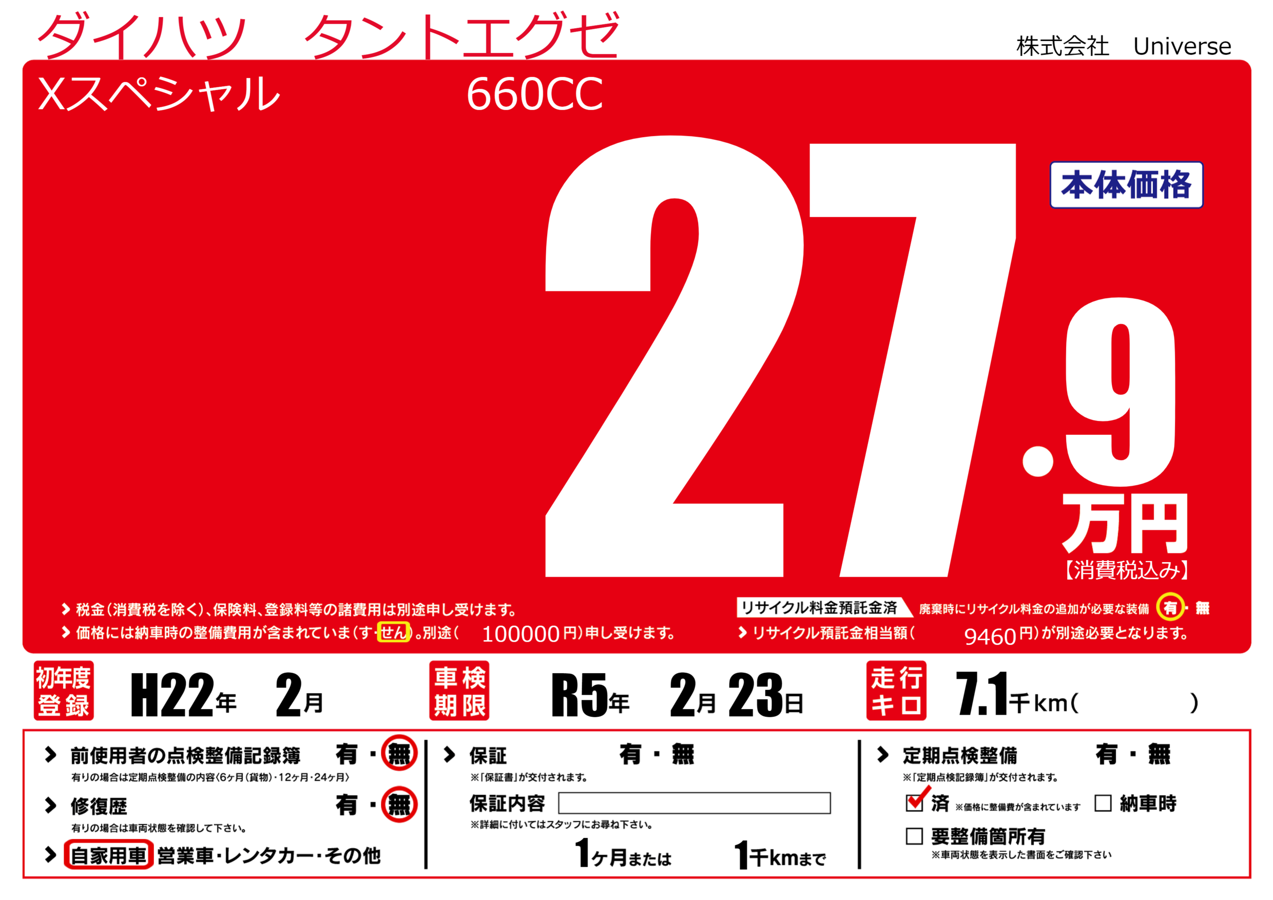 | 車名 | ダイハツ タントエグゼ | グレード ミッション 排気量 |