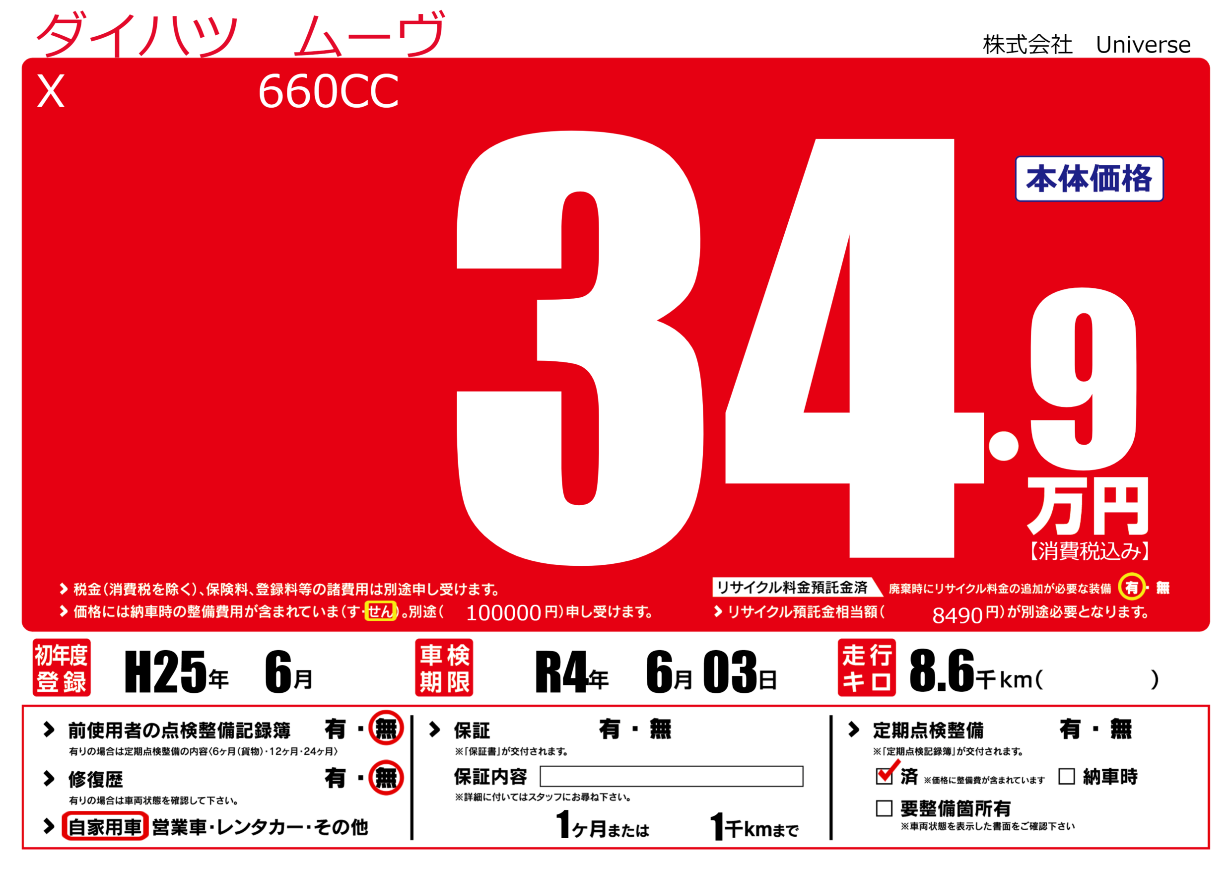| 走行キロ | 0.8万km | 初年度登録 | H25年6月 |
