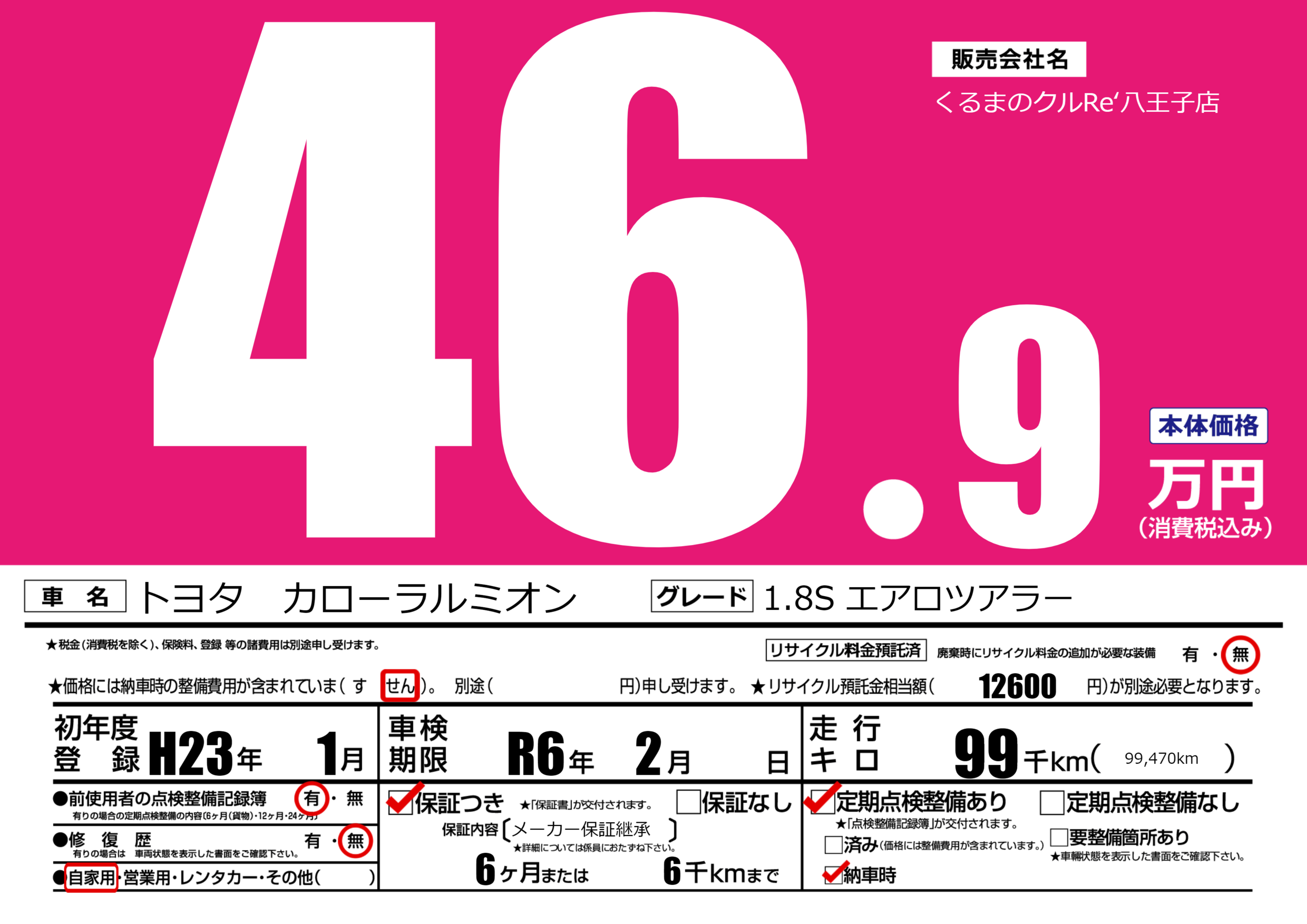 保証付き 保証内容(メーカー保証継承) 6ヶ月または(6)千kmまで |
