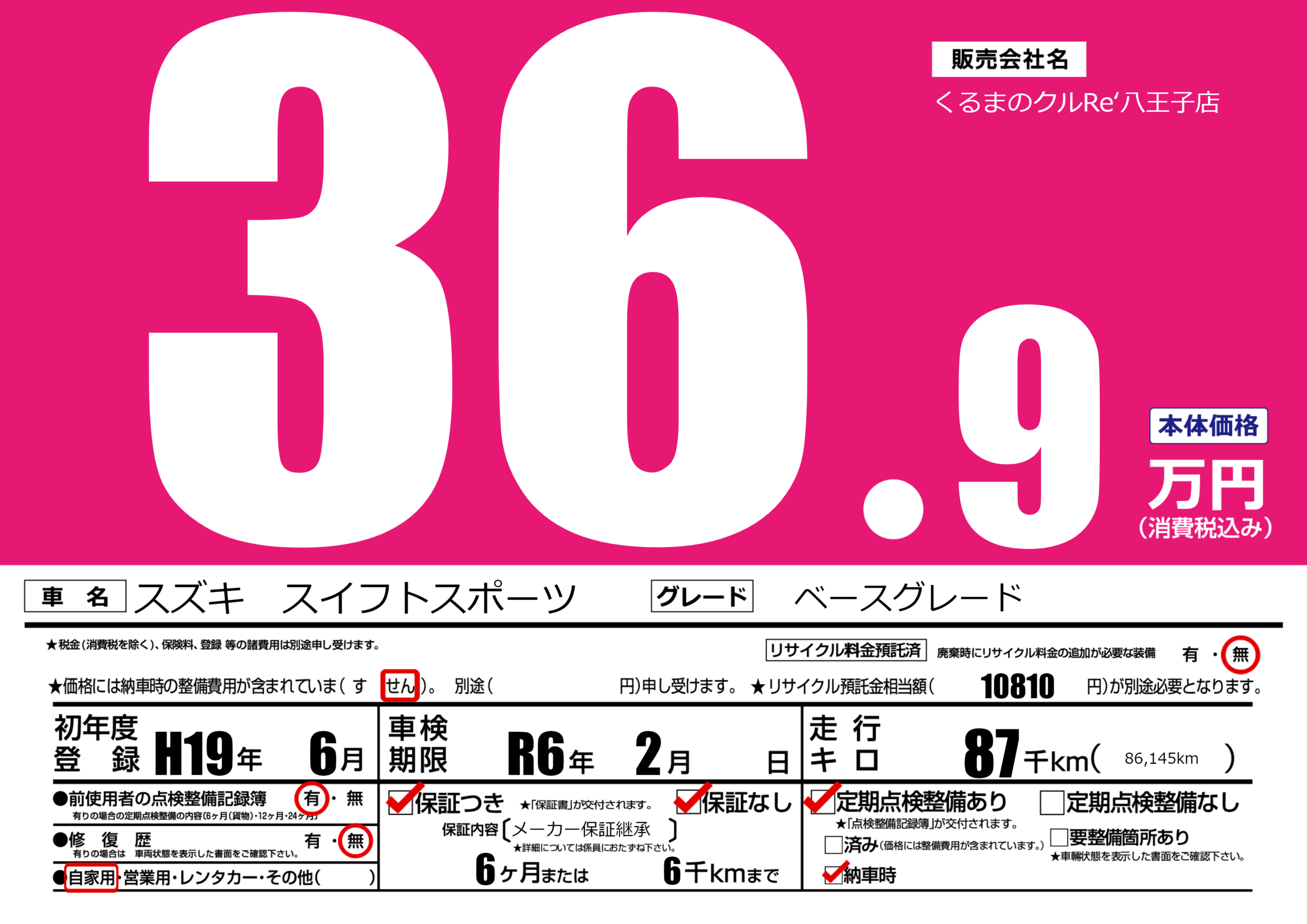 | 車名 | スズキ スイフトスポーツ | グレード ミッション 排気量 |