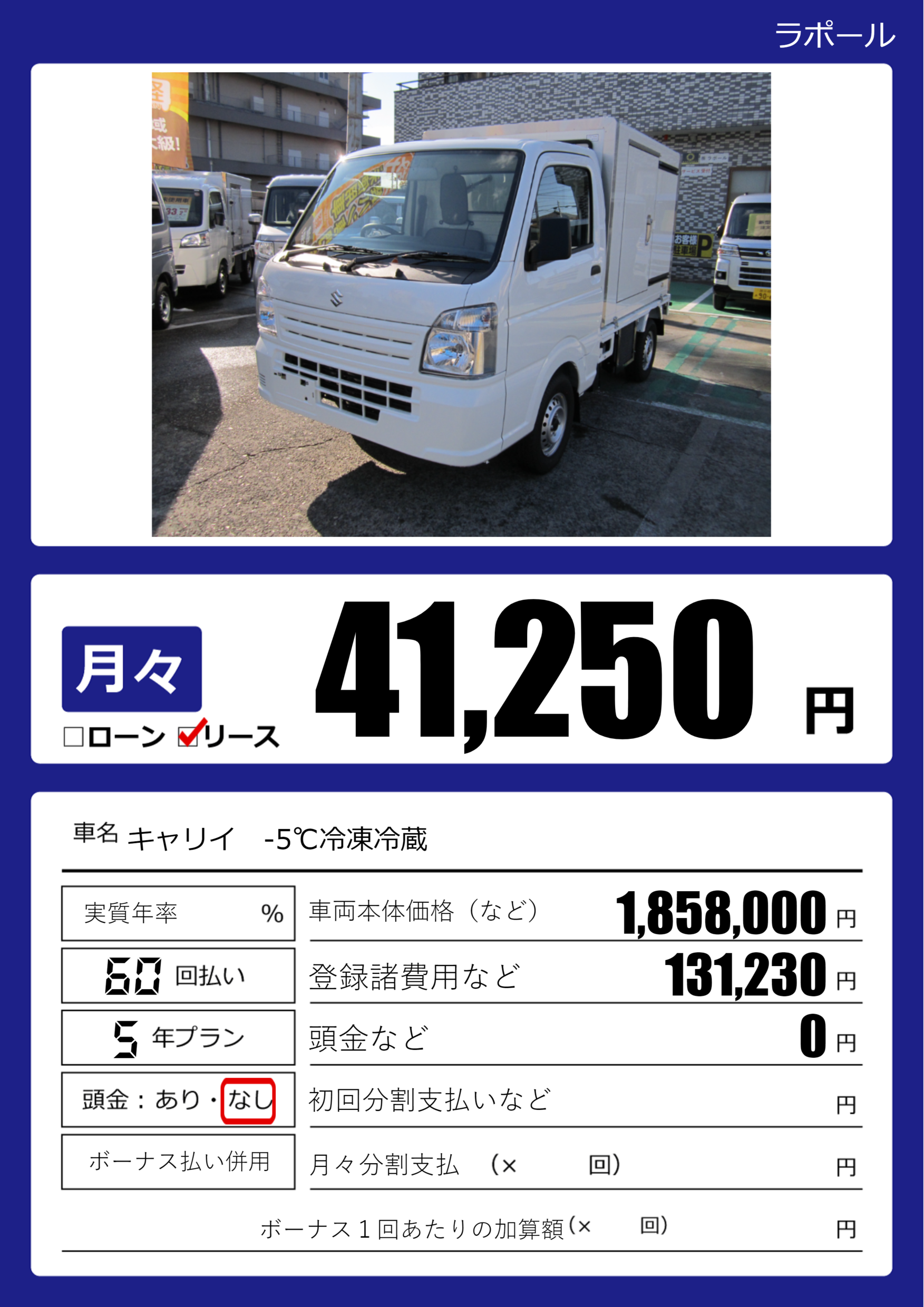 | 車名 | キャリイ -5℃冷凍冷蔵 | グレード ミッション 排気量 |