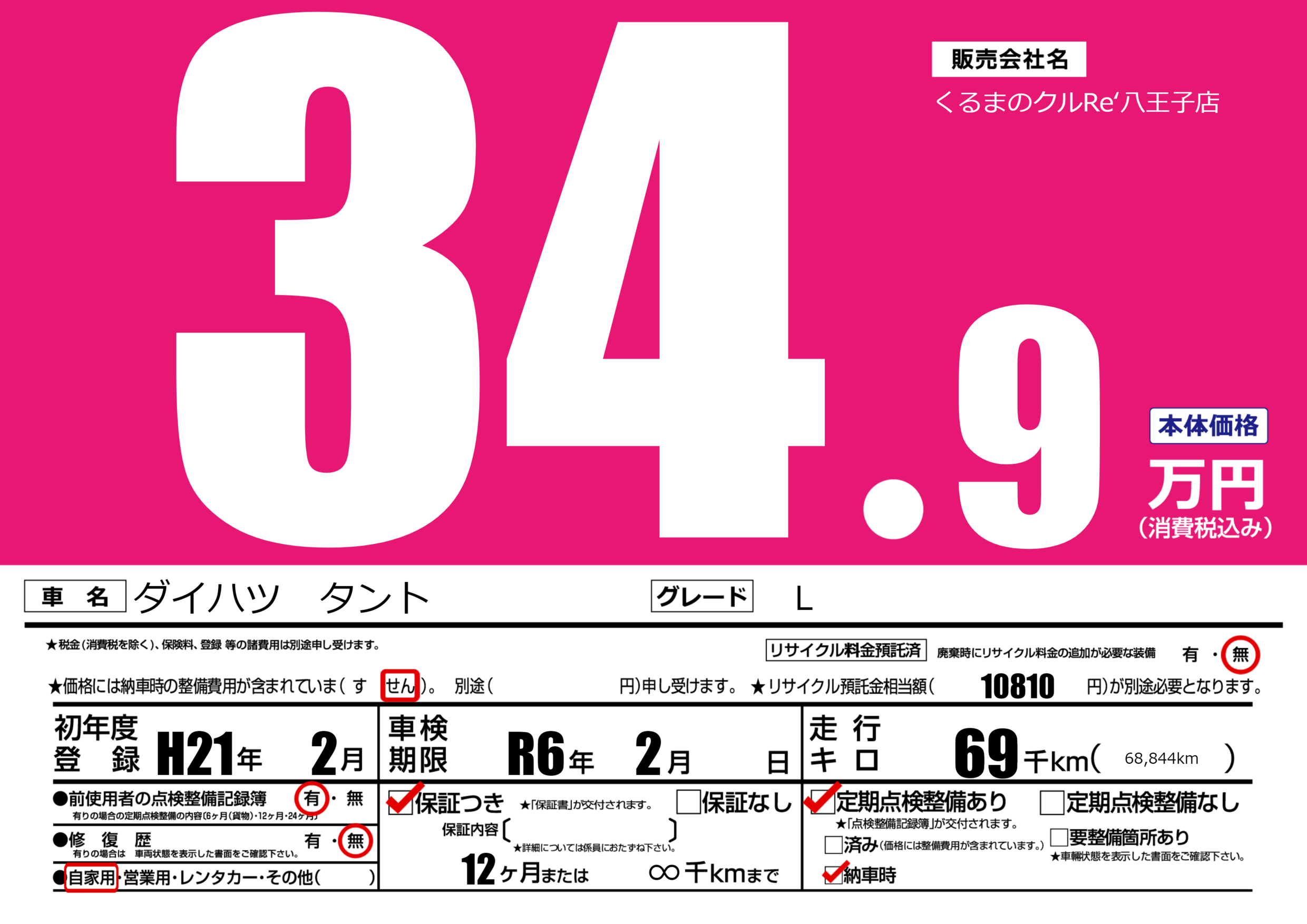 なし | 車検制限 | R6年2月---月 |