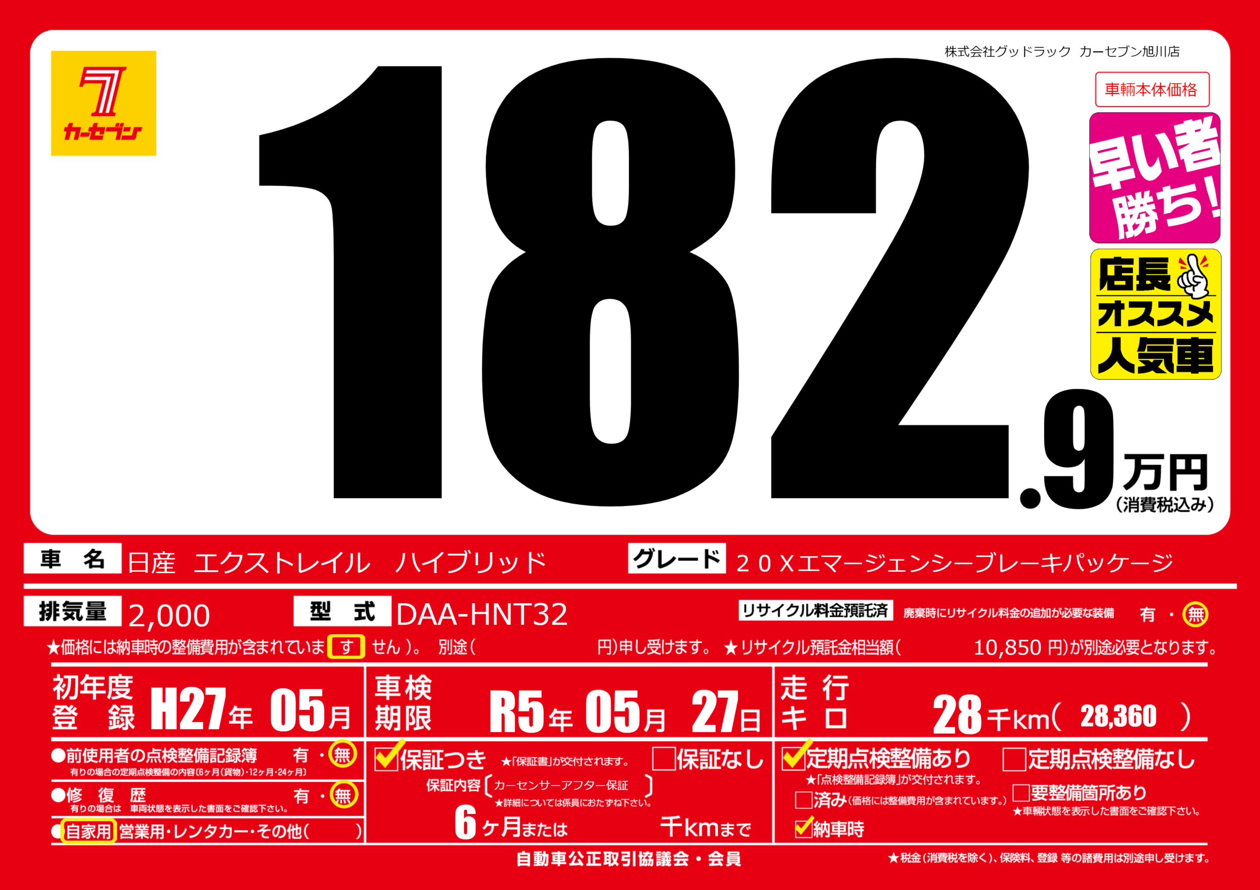 | 車名 | 日産 エクストレイル ハイブリッド | グレード ミッション 排気量 |