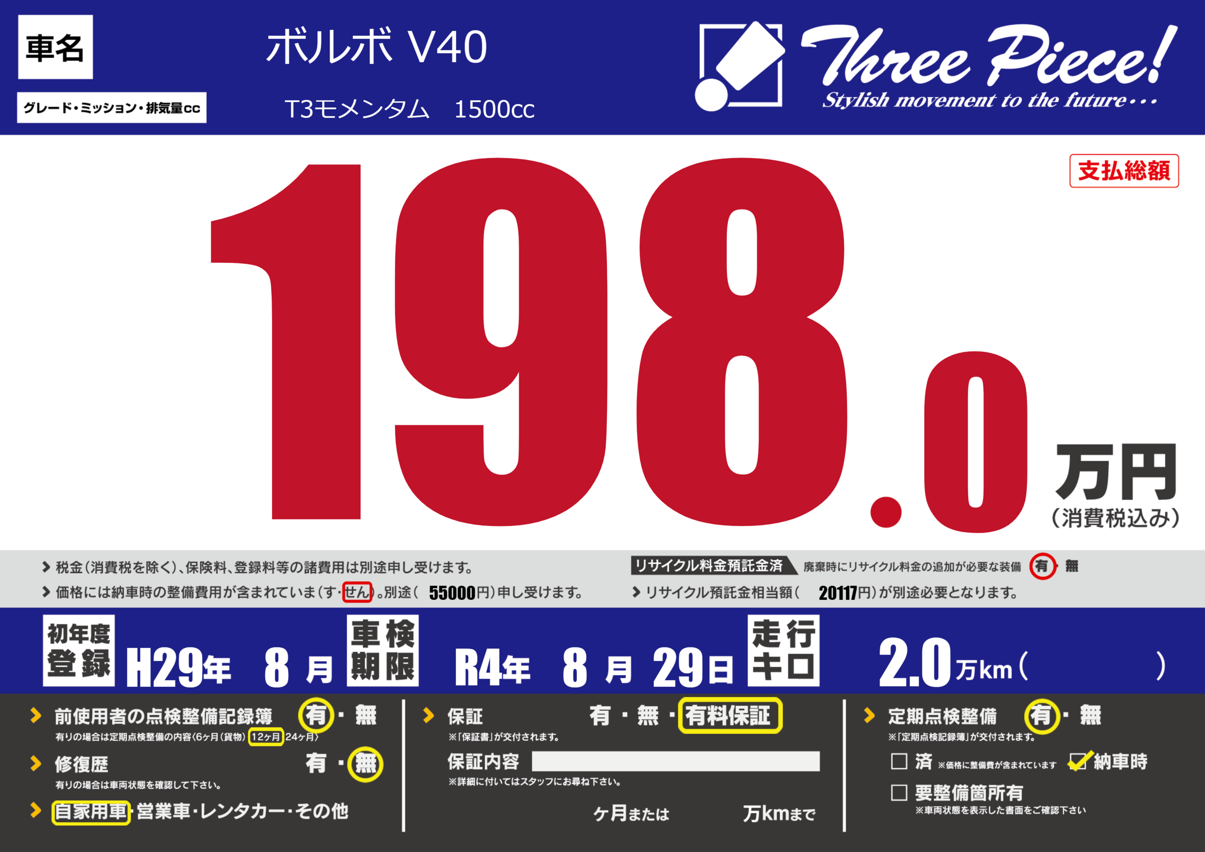 | 車名 | ボルボ V40 | グレード ミッション 排気量 |